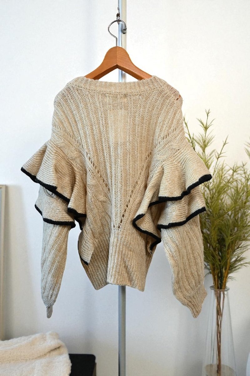 身頃から袖に向かってあしらわれた大振りフリルが可愛い、セーターです。