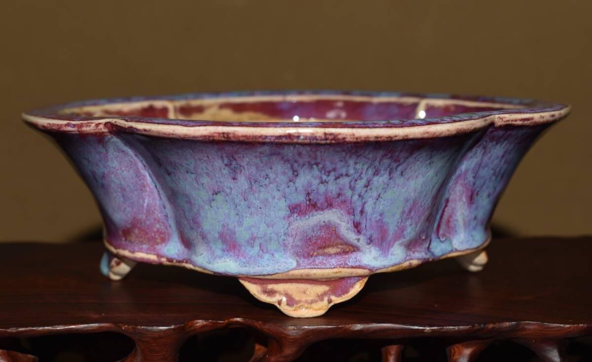 人気釉薬作家<最高峰の発色・福田桂雲・紫辰砂釉・大観展釉薬部門金賞受賞作家・発色抜群>外縁下紐木瓜鉢・間口17,8cm