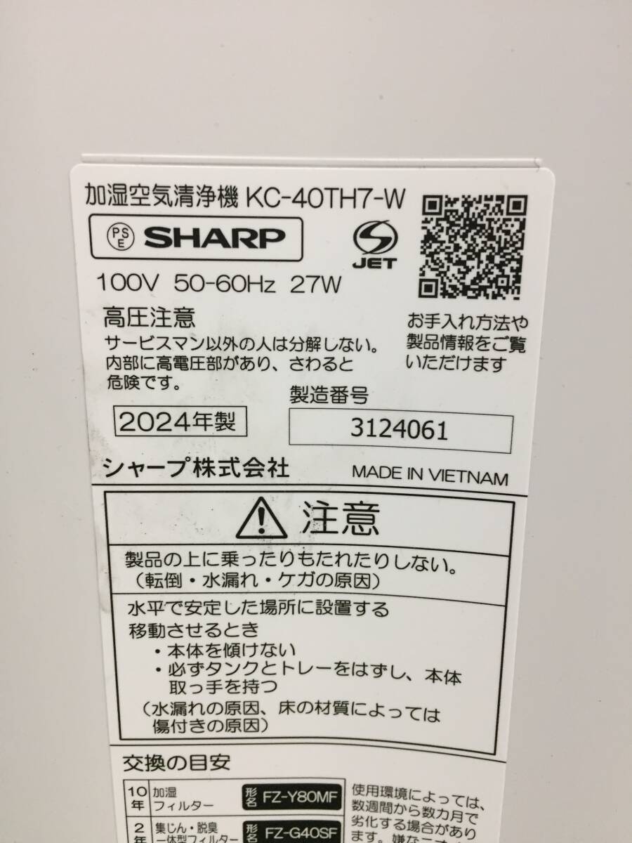 Product name: SHARP シャープ 加湿空気清浄機 KC-40TH7-W ホワイト 2024年製 タンク容量約2.5L 高濃度プラズマクラスター7000 空調家電 26-6