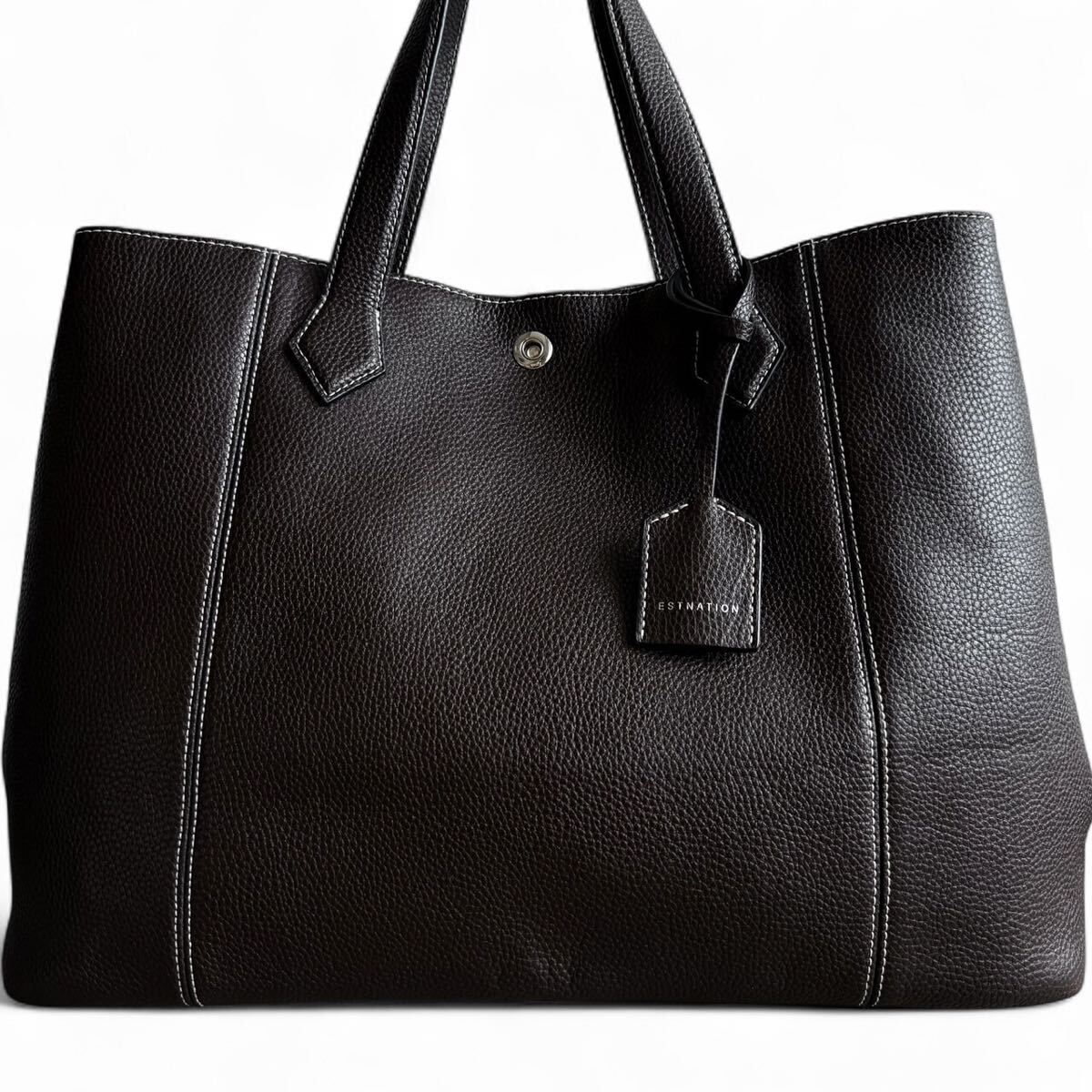 こちらは、エストネーションらしい上品な存在感を放つトートバッグ。厚みのあるシボレザー調の合成皮革を採用し、柔らかな手触りと重厚感を兼ね備えた仕上がりです。深みのあるダークブラウンのカラーにホワイトステッチが映え、シンプルながらも確かな高級感を演出。フロントにはブランドロゴ入りのチャームが揺れ、洗練された印象を与えます。