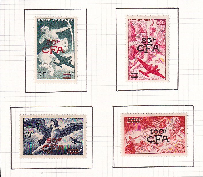 6 レユニオン【未使用】<「1949 SC#C35-C38 (航空) 《CFA》加刷・改値 on フランス#C18-C21」 4種完 on リーフ切取り >