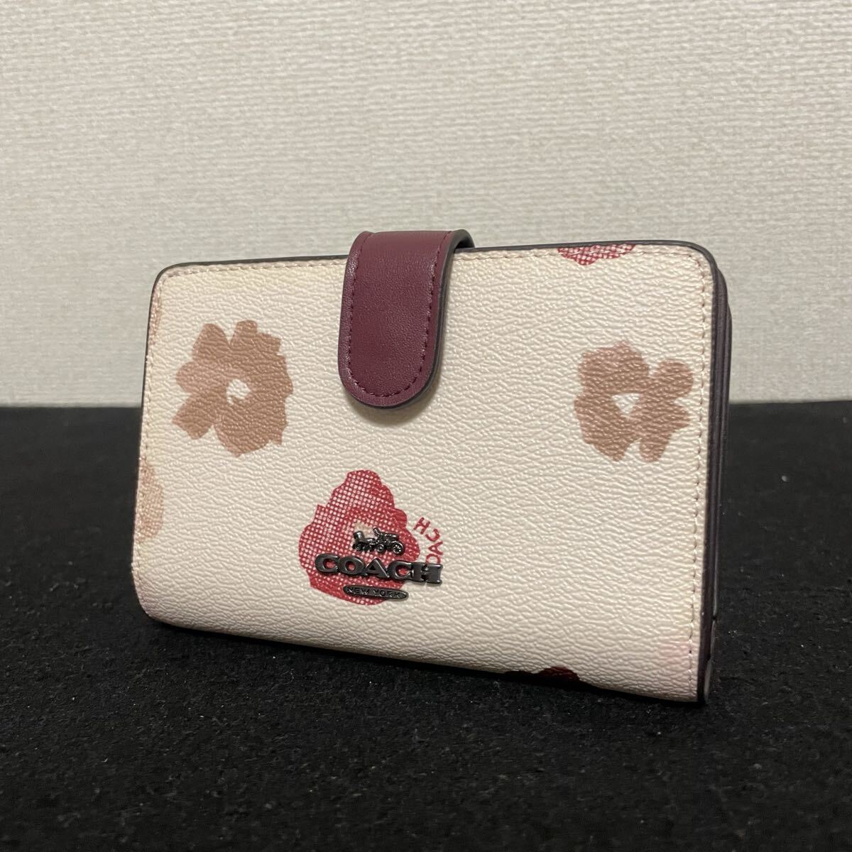 Product name: 1円スタート! 訳あり 未使用保管品 COACH コーチ 二つ折り財布 ウォレット 花柄 財布 ホワイト系 ワインレッド L字ファスナー
