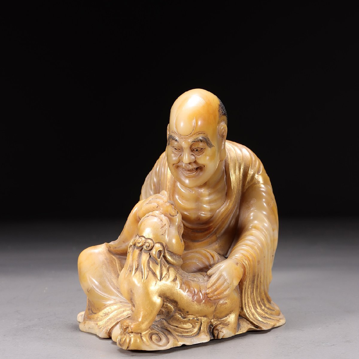 Product name: 【安】清時代 寿山芙蓉石彫 漆金 戯獅子羅漢坐像 共箱 極細工 古置物 古擺件 中国古美術 時代物 331