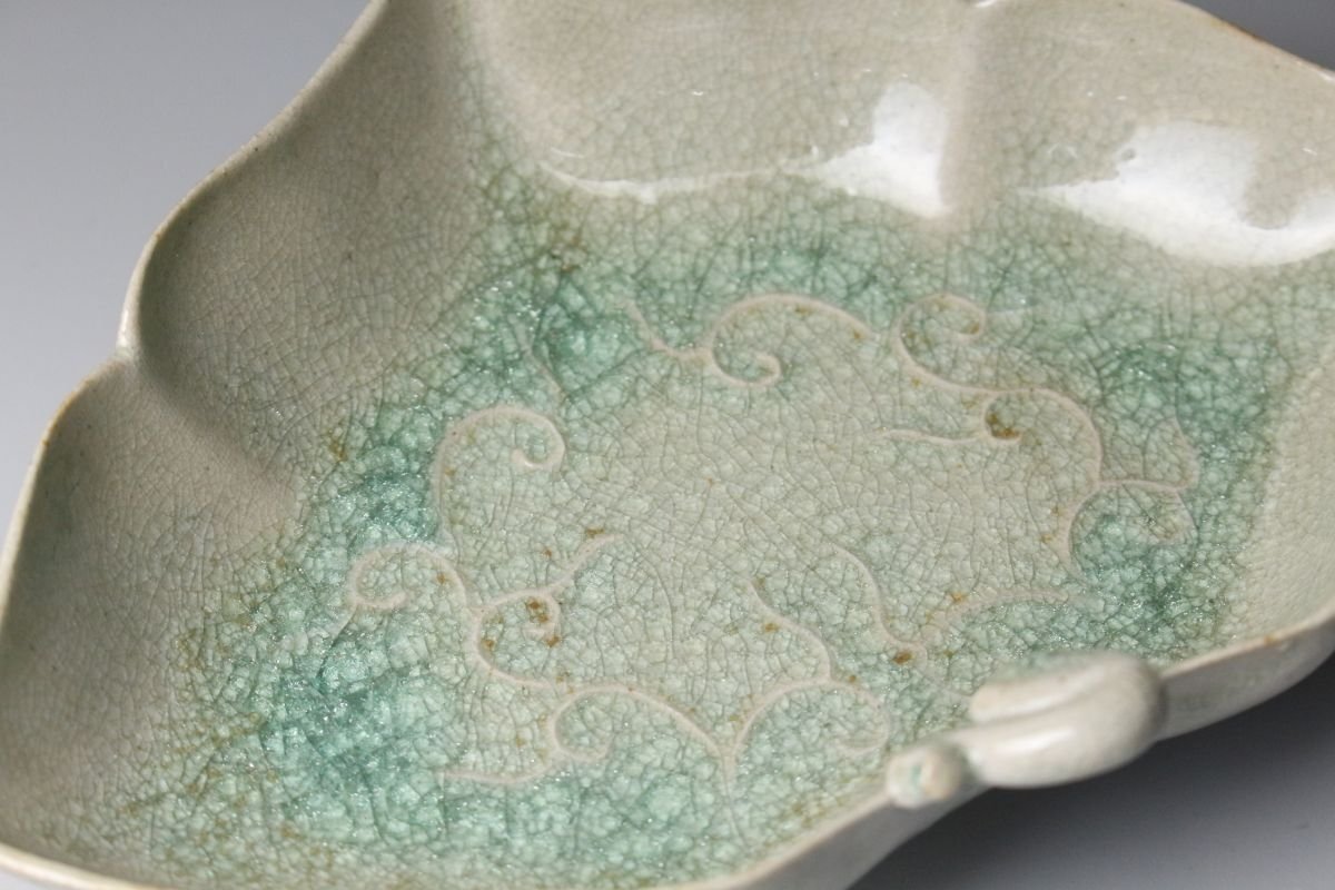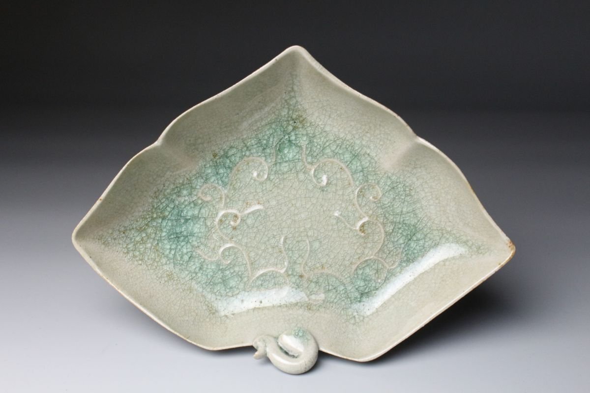 淡く透明感のある釉薬がしっとりと全体を包み、葉脈の繊細な陰影が浮かび上がるその姿は、まさに静謐なる美。端正な造形と優雅な色調が見事に調和し、献上品としての風格と繊細な感性が感じられます。
