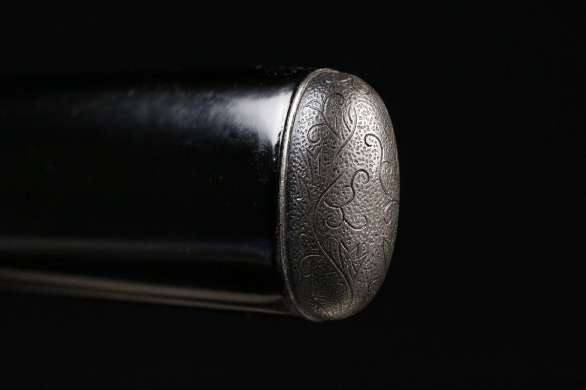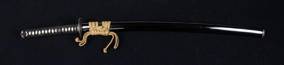 艶やかな漆黒の拵には、凹凸のある金属地に繊細な唐草文の縁頭と鐺が優雅に映えています。
