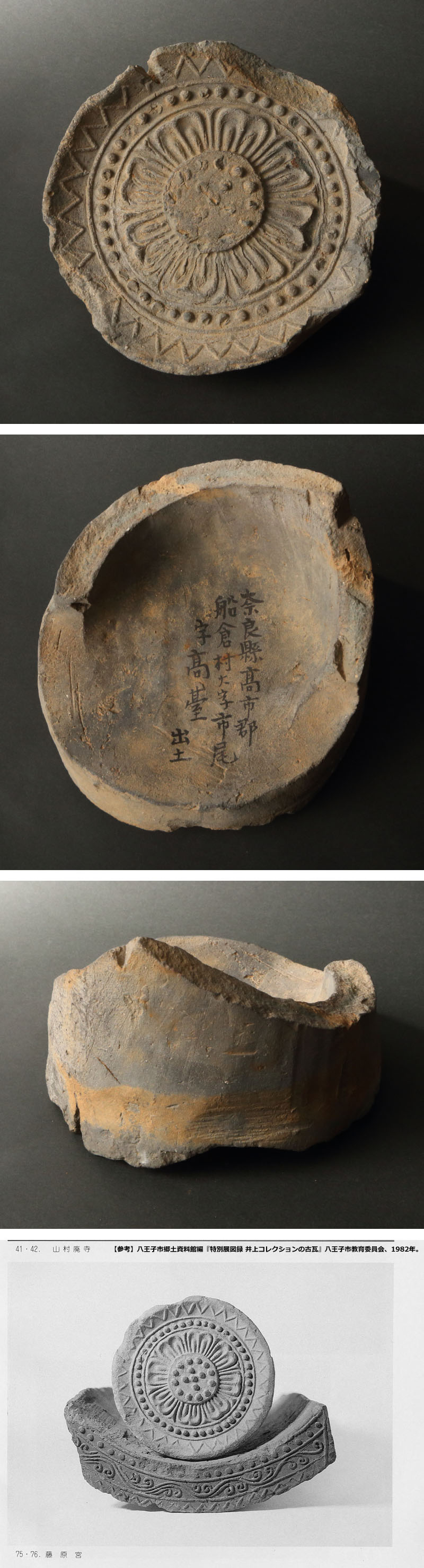 中でも本作は井上郷太郎所蔵の藤原京跡出土の軒丸瓦と同笵とみられ、渡来系の工人が多く住んだ高市郡から紀路(巨勢路)を通り藤原京へと運ばれたことが想像されます。見事な逸品です。