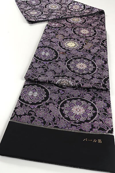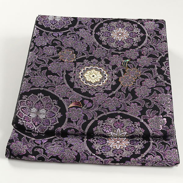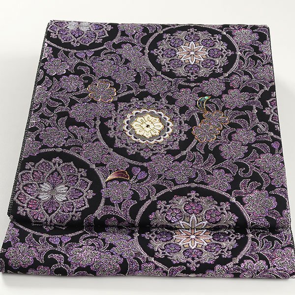 全体には白色や光沢のある紫色の糸、パール箔で華文や桜が織り上げられております。