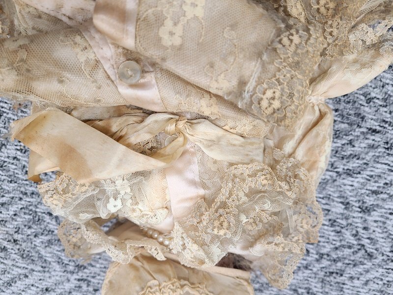 ・服等の布部分にシミや色焼け、ほつれなどがあり劣化が目立ちます。