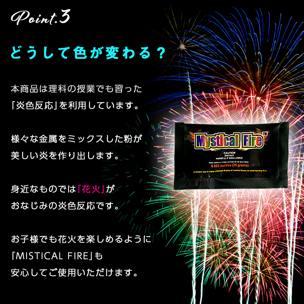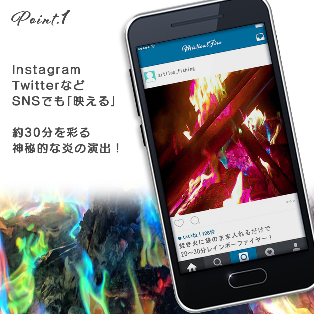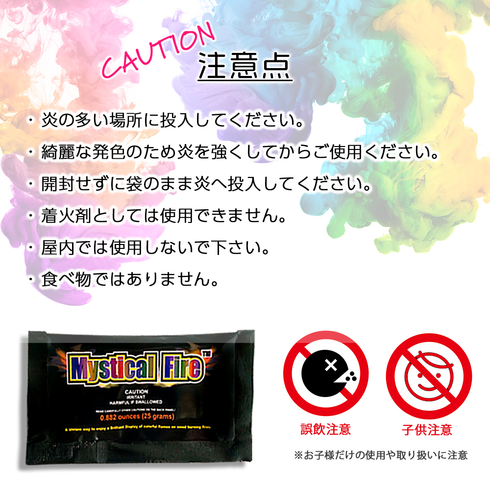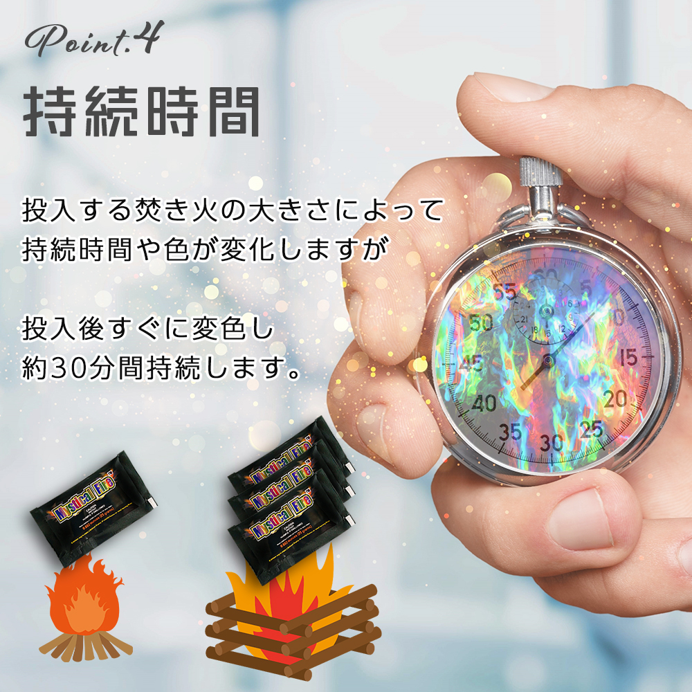 焚き火中にふりかけると20分~30分レインボーカラーのファイアーが楽しめ インスタ映え間違いなしのアイテム。