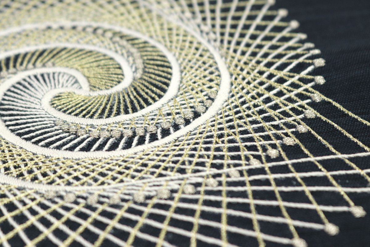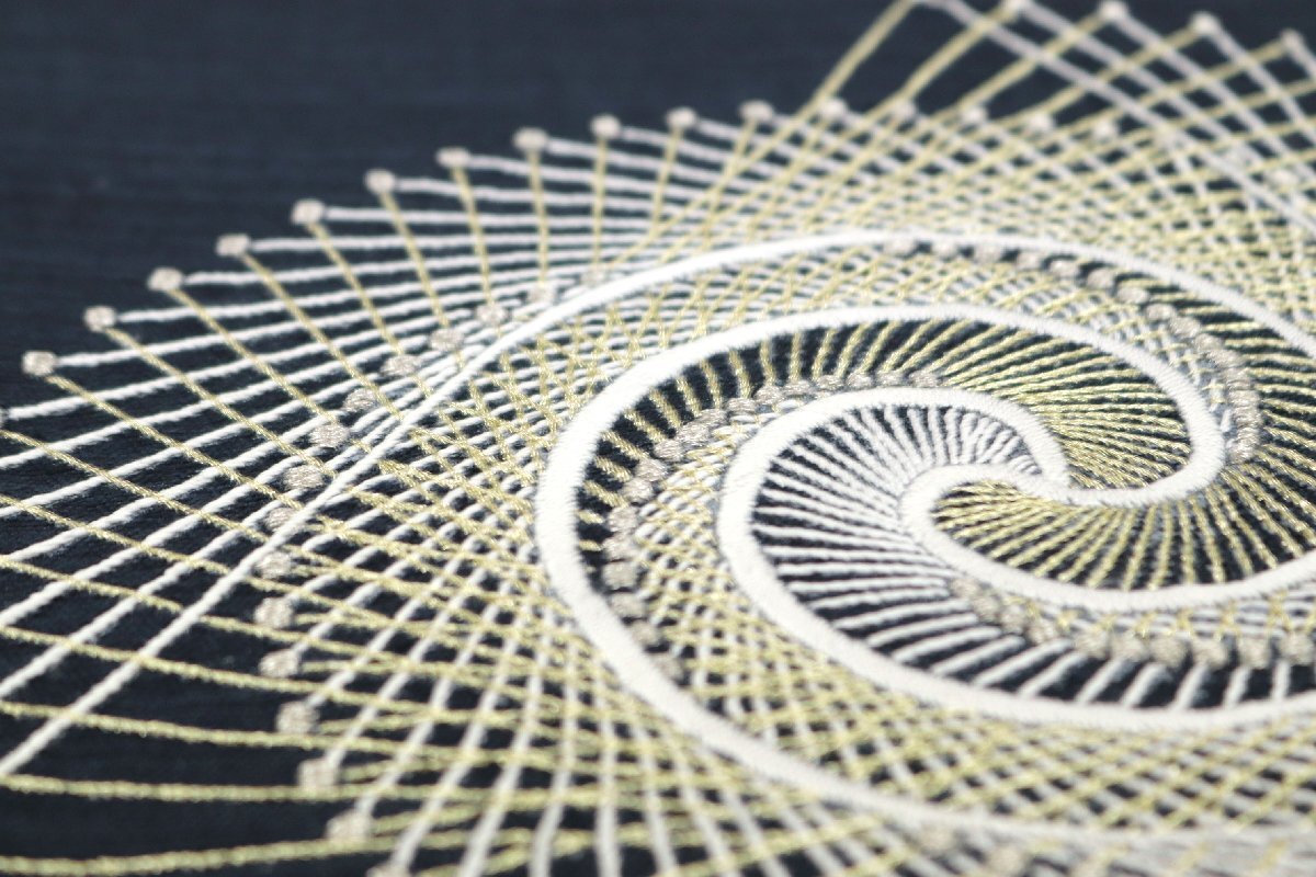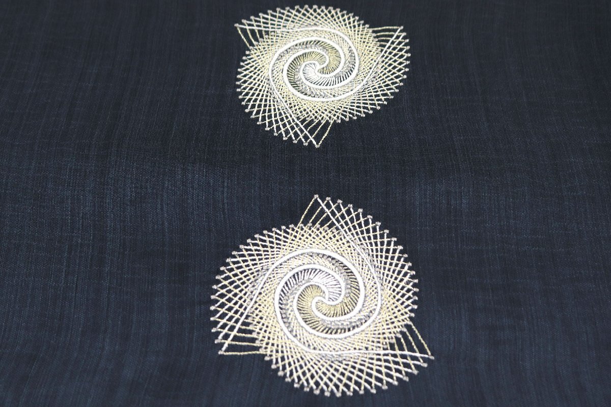 お太鼓や胴部分には、白色、金銀糸で幾何学調の渦巻模様が刺繍されております。