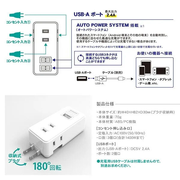 ●USBポート:定格出力(USB-Aポート)/DC5V 合計2.4A(最大)