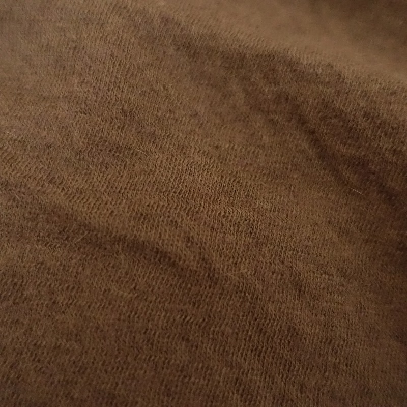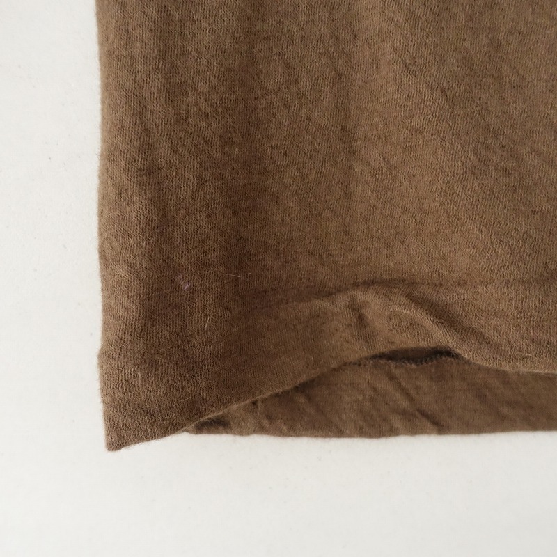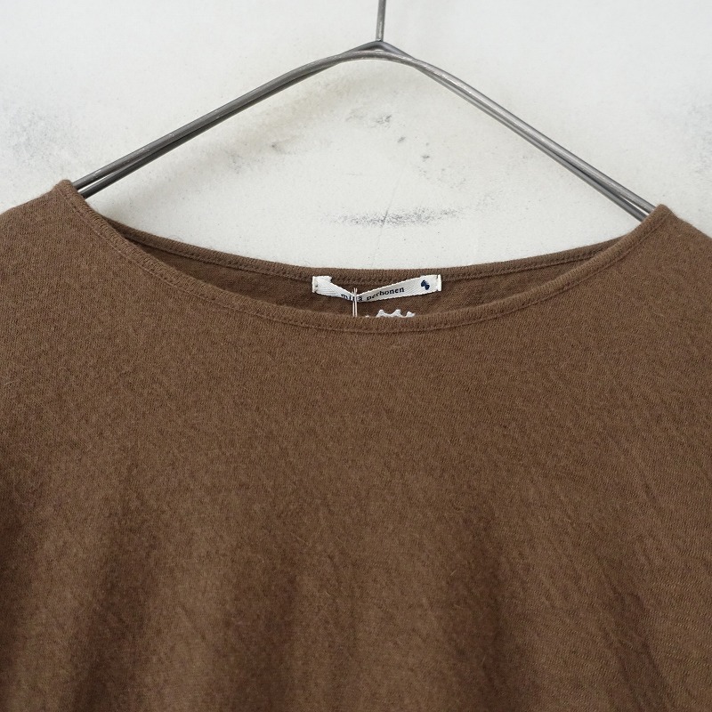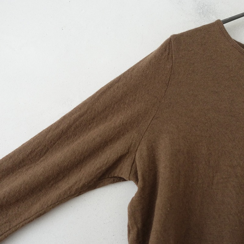 mina perhonenの「cozy」ラウンドネックロングスリーブアンゴラ天竺シャツです。カラーはブラウンです。フワッとエアリーな、アンゴラ100%の微起毛天竺ニットを使用。ラウンドネックの長袖シャツです。ポケットはございません。定価(メーカー希望小売価格)17,850円の商品です。