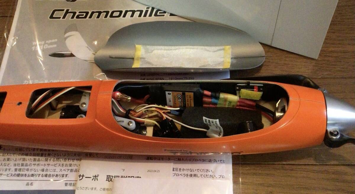 前作のカモミールよりも格段に性能向上しています。受信機、電池を外した状態で 出品致します。ESCや、全サーボ、OK模型タマゾーの純正品を搭載しています。 モーターはTahmazo ER-221912d にパワーアップしています。3S600mA位が合います。適宜 飛行しながら重心を微調整して下さい。全て新品からの製作です。1度 飛行調整を実施しています。取説に忠実に組み上げっています。三分割では、現場で組み立てが面倒なので、普段は右翼をマスキングテープで止めて 二分割で(写真参照)保護用のプチプチに入れて 保管していました。