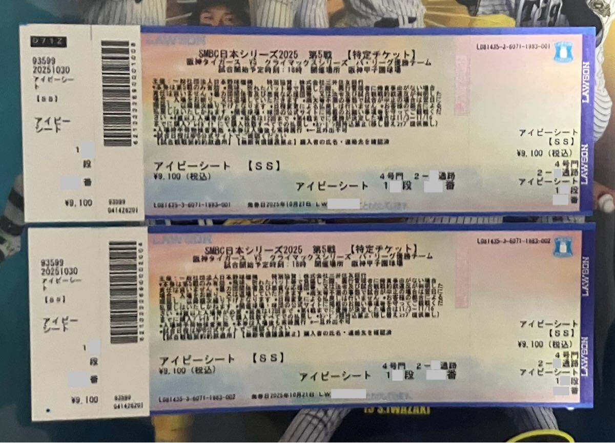 Product name: 阪神甲子園球場 SMBC日本シリーズ2025 第5戦 阪神タイガース vs 福岡ソフトバンクホークス アイビーシート 15~20段 通路側席を含む2席連番