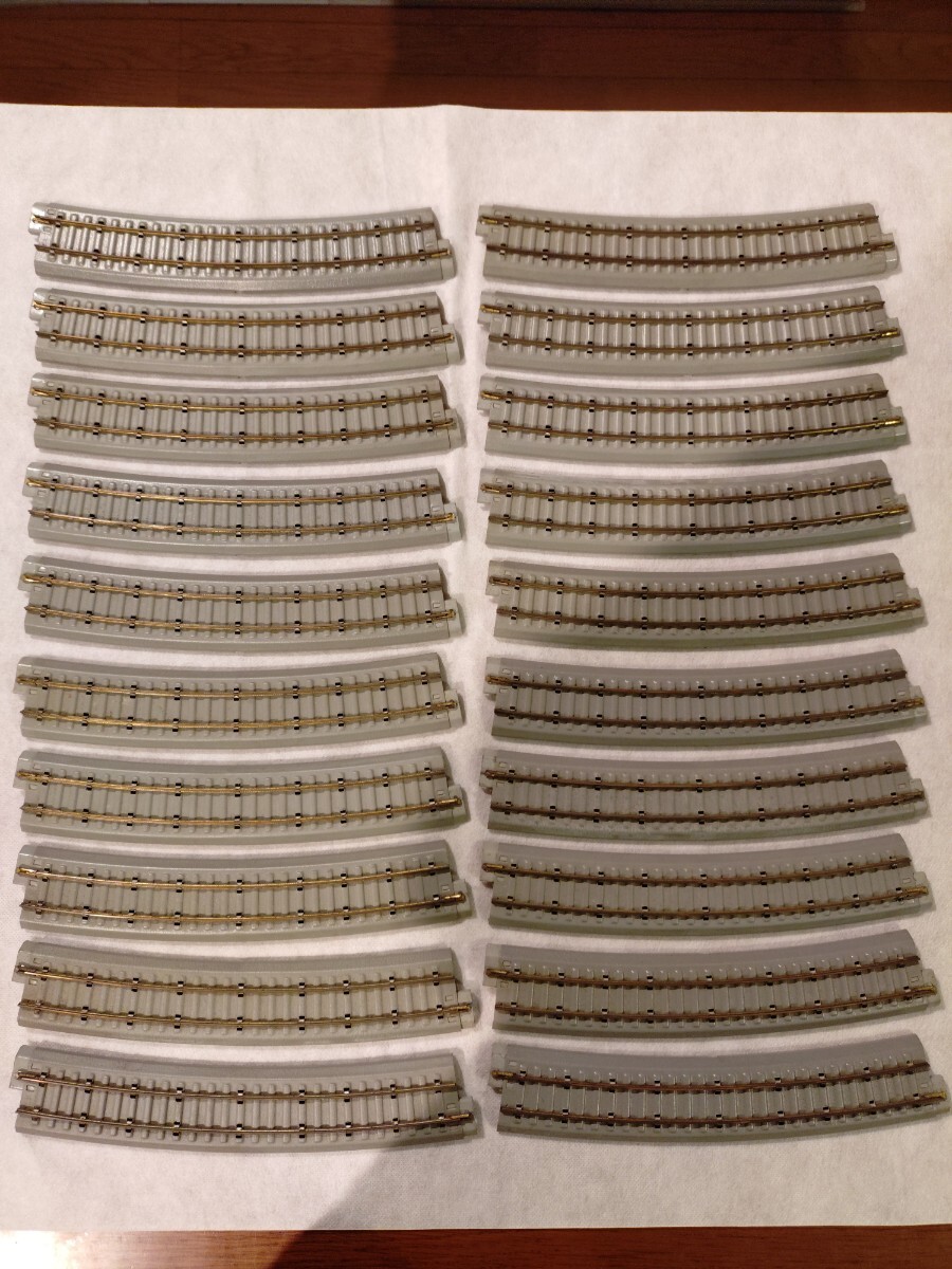 少し前に当オークションで他の車輌と一緒に落札したエンドウ製の曲線線路(750R)20本組と予備2本、ポイント右(750R)1本です。元箱はありません。他の車輌が落札目的でしたので、出品することにしました。