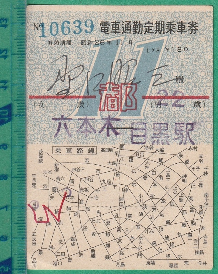 鉄道切符73■東京都交通局 電車通勤定期乗車券 / 六本木-目黒駅 / 昭和26年
