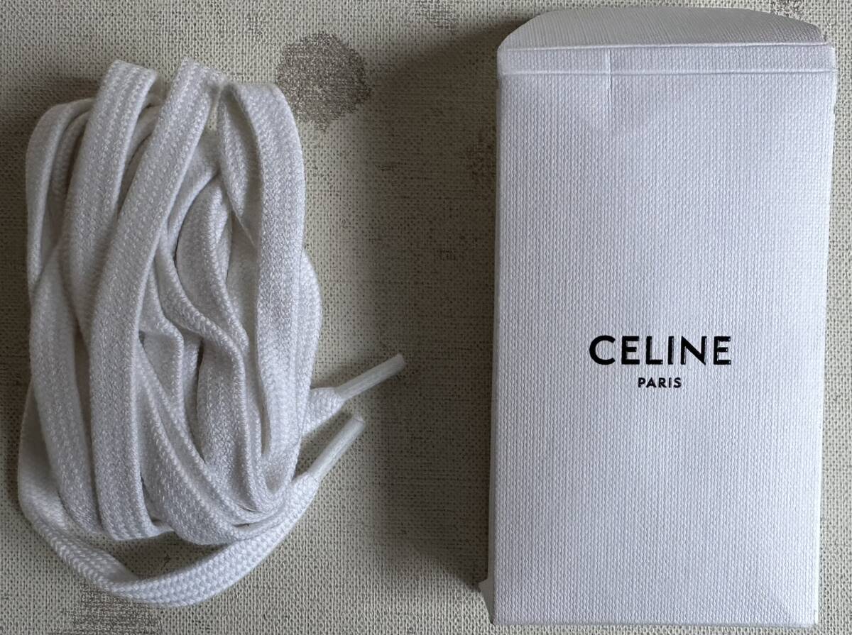 CELINE PARIS by エディ・スリマン セリーヌ レザースニカー41 美品です。サイズ:41 アウトソール27cm。ワイズ9.7cm。ソール2cm。ソール込みの全高13.3cm。マテリアル:牛革+ゴム。イタリア製。爽やかなホワイトにゴールドの切り替えしにセンスの良さが伺えます。3回ほどの着用です。付属品はオリジナルの外箱+シューズ袋+取扱説明書+スペアの替紐です。状態は10段階で9位です。コレクターの方でご理解頂ける方のみノークレーム・ノーリターンでお願いします。