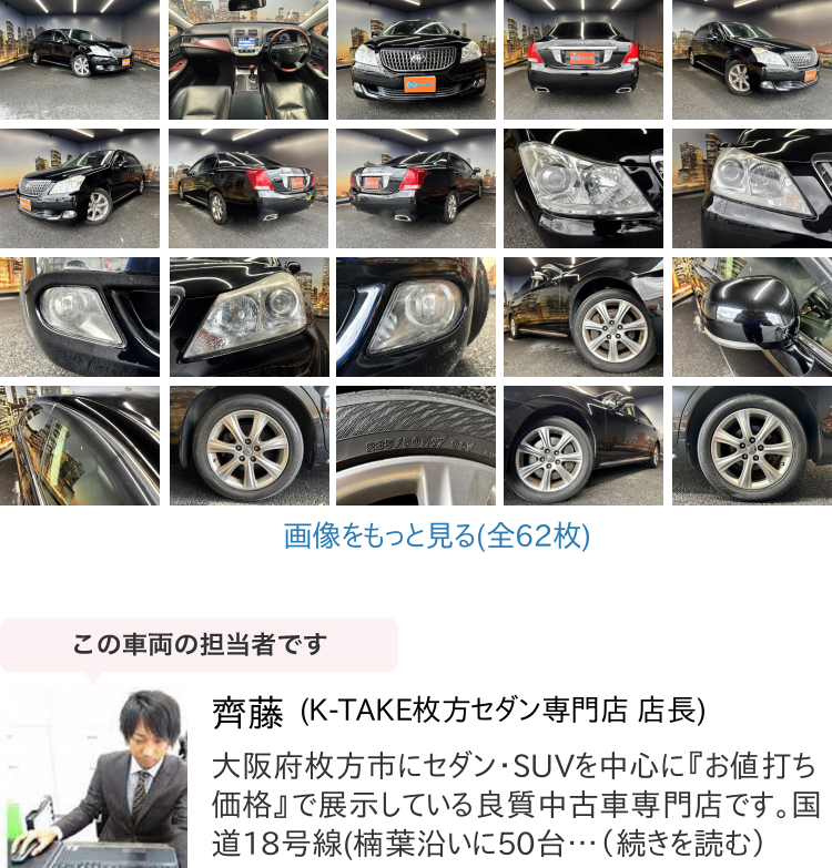 K-TAKE枚方店は国産セダン・SUV・ステーションワゴンを中心に取り扱いしております。趣向性の高い車種になりますので、専門知識を持ったスタッフにてご案内させて頂きます。コーティングやカスタム等はもちろん、任意保険、オートローンまで安心のカーライフをお約束致します。整備、保証などのアフターサービスも当店ですべて行えますのでご安心ください。当社は全国のオークション会場、約160カ所と業務提携を結んでおります。全国60000台以上の中古車を当店でご商談、ご契約、ご納車可能です!