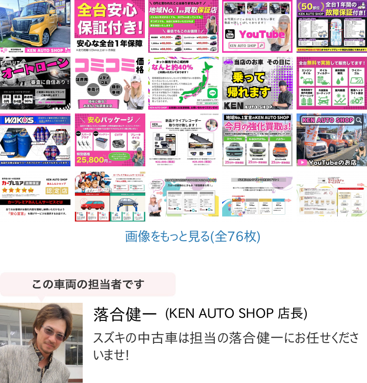 基本現状販売ではございますが、薄利多売とはいえ、全台50部位1年保証付帯(20年超え/15万km超えの場合は1か月/1000km)、内外装は磨きや徹底したルームクリーニング実施、当店で出来る範囲で加修や全台エンジンオイル/エレメント交換、液体類補充又は交換、当店で取り替えたほうがいいと思う部品は交換し、乗って帰れる状態まで仕上げてから販売しております。軽自動車はその日に乗って帰る事も出来ます!