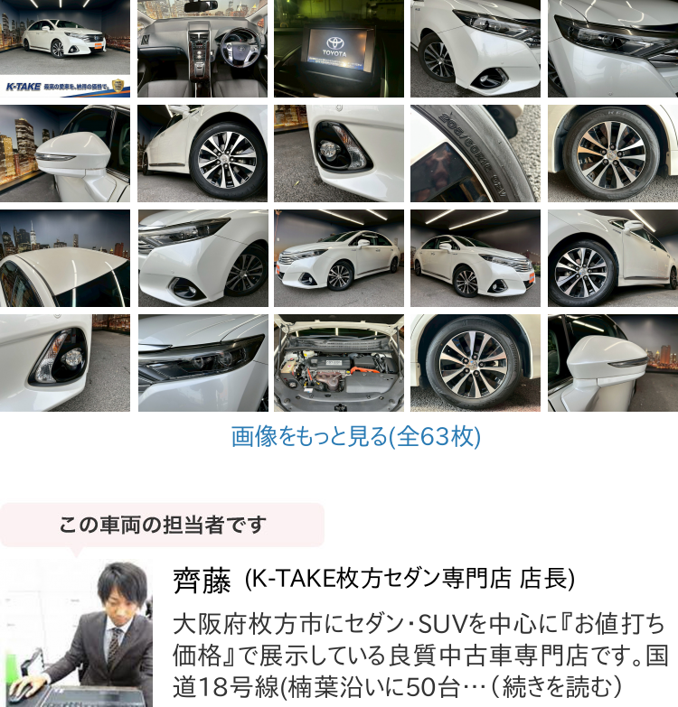 K-TAKE枚方店は国産セダン・SUV・ステーションワゴンを中心に取り扱いしております。趣向性の高い車種になりますので、専門知識を持ったスタッフにてご案内させて頂きます。コーティングやカスタム等はもちろん、任意保険、オートローンまで安心のカーライフをお約束致します。整備、保証などのアフターサービスも当店ですべて行えますのでご安心ください。当社は全国のオークション会場、約160カ所と業務提携を結んでおります。全国60000台以上の中古車を当店でご商談、ご契約、ご納車可能です!