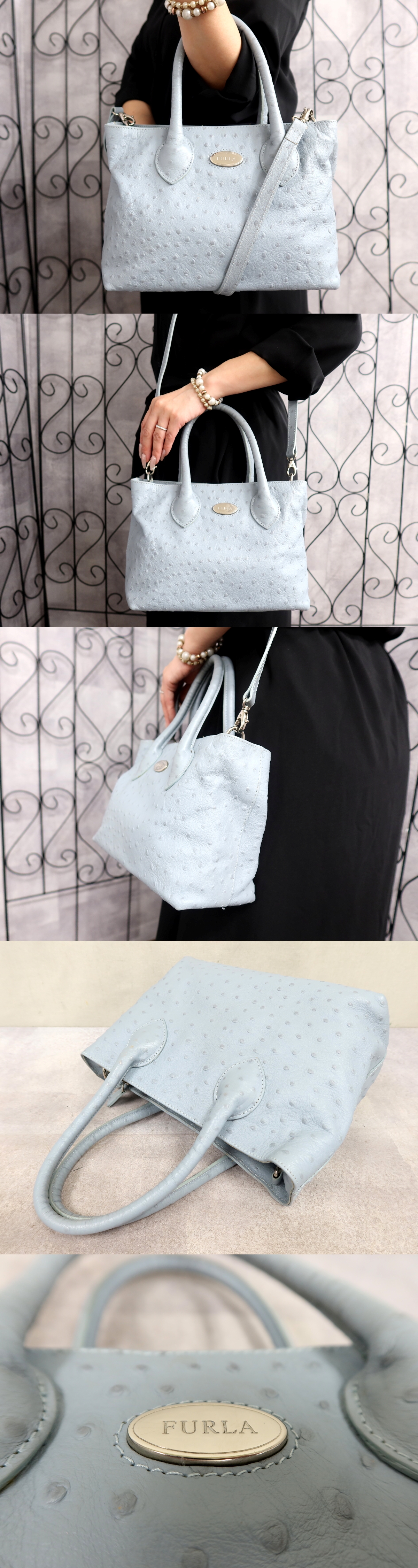 Product name: ●超美品●FURLA フルラ●オーストリッチ 型押し カーフ レザー 本革●2way ハンド バッグ●ライトブルー●シルバー金具●かばん●Js67301