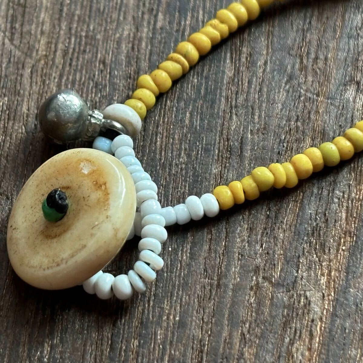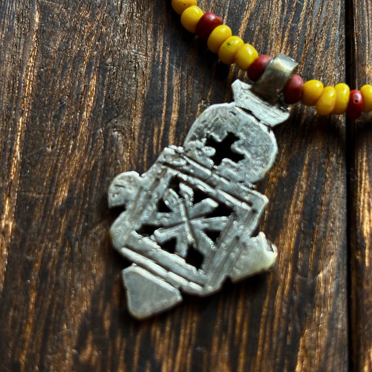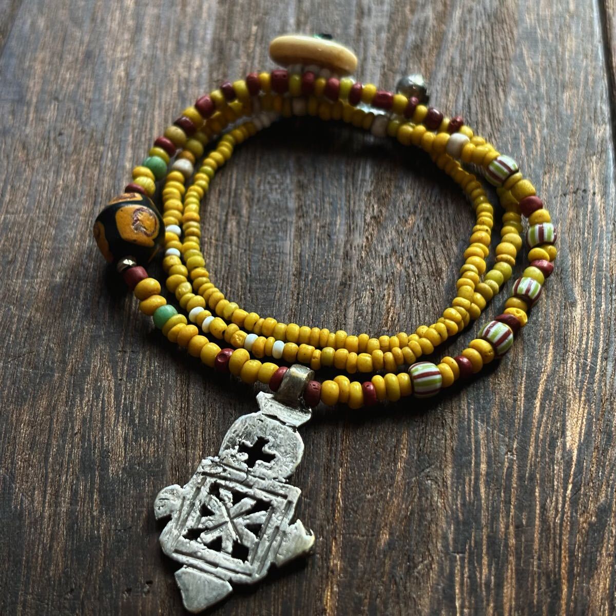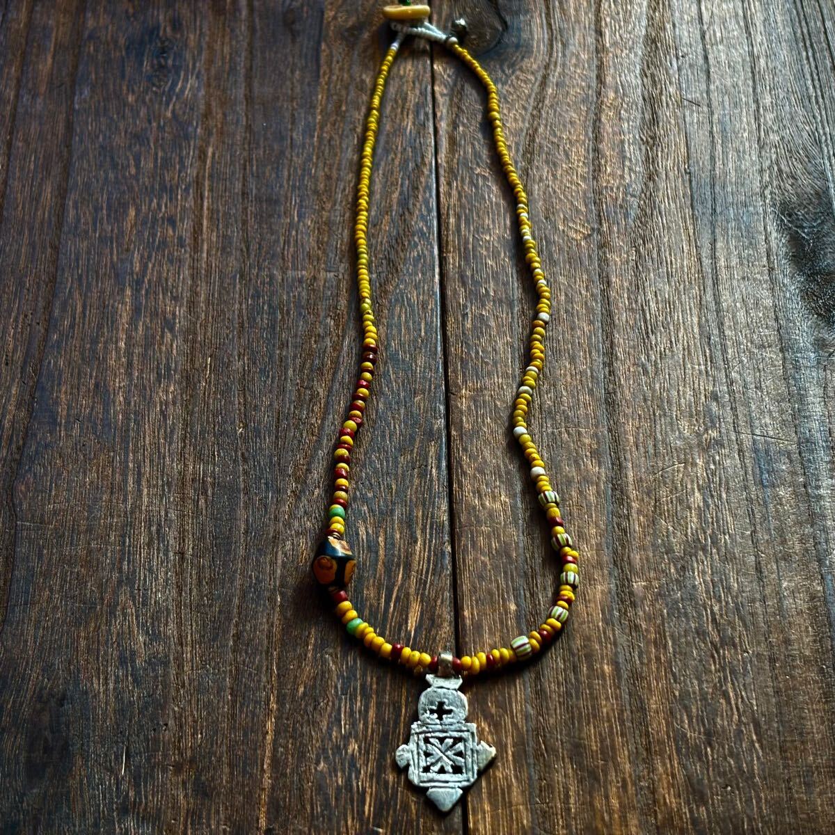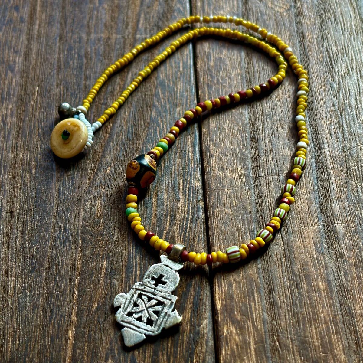 トップに42×25mmのエチオピアンクロス(コプトクロス)を付け、10世紀前後に作られジャワ島で出土した黄、赤茶、黄緑、白の古代インドパシフィックビーズに1800-1900年初期にヴェネチアで作られアフリカにトレードされたキングビーズやカンネッテ、白いカリマンタン出土ビーズを繋いだネックレスです