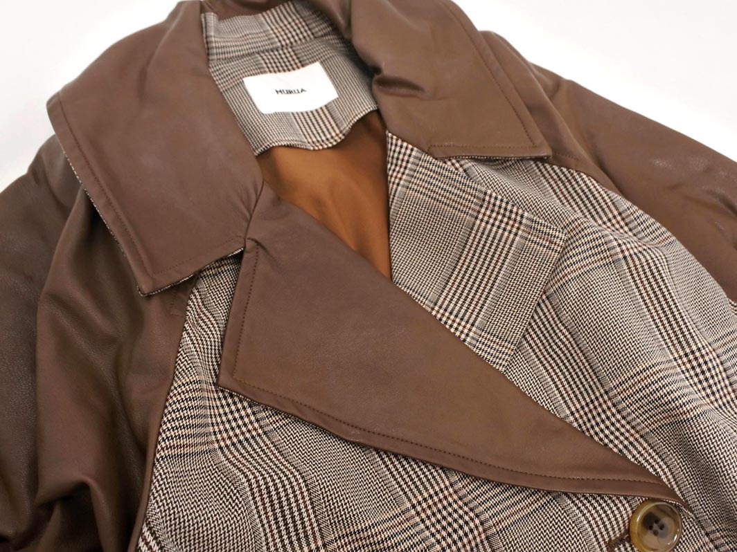 MURUA ムルーア フェイクレザー 切替 グレンチェック ロング コート sizeF/茶 ◇■ ☆ ekc2 レディース