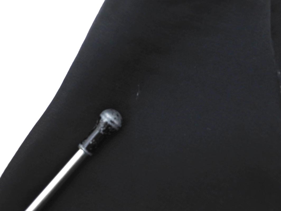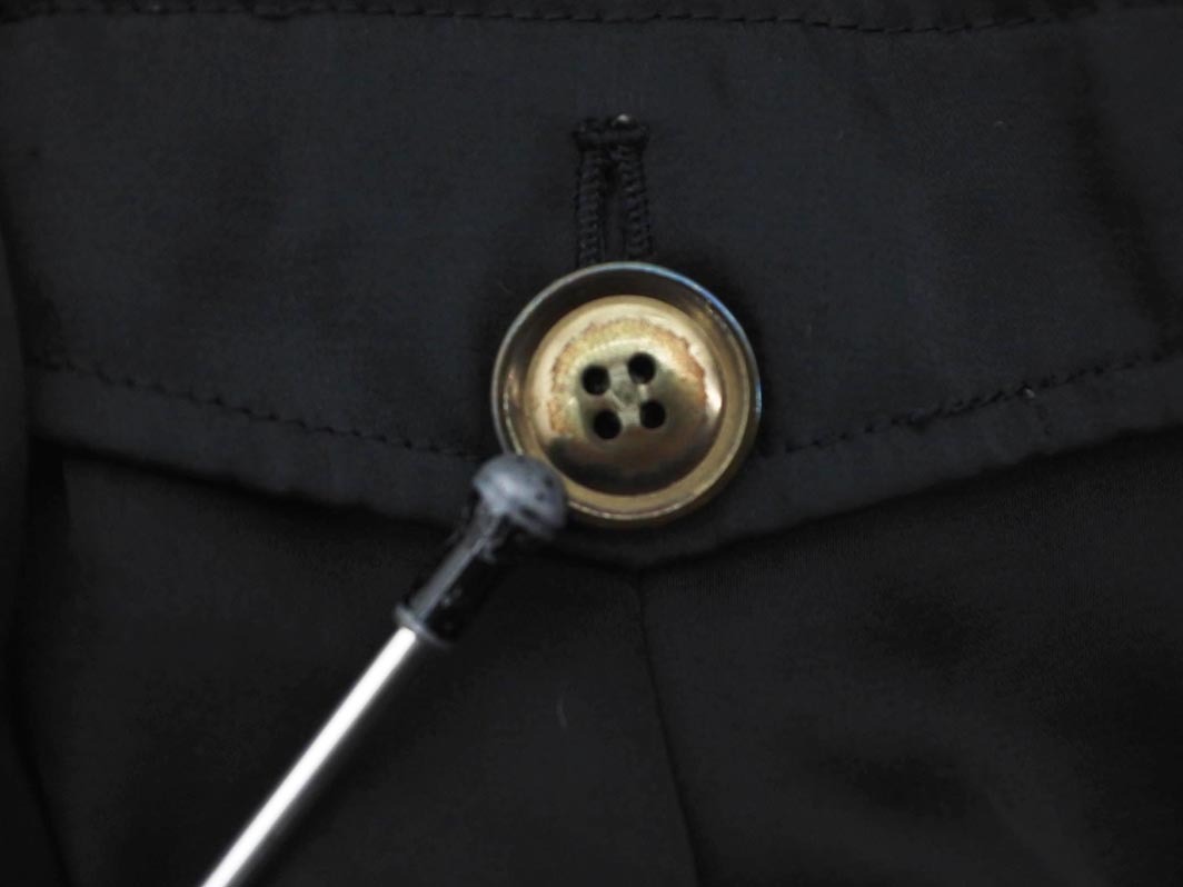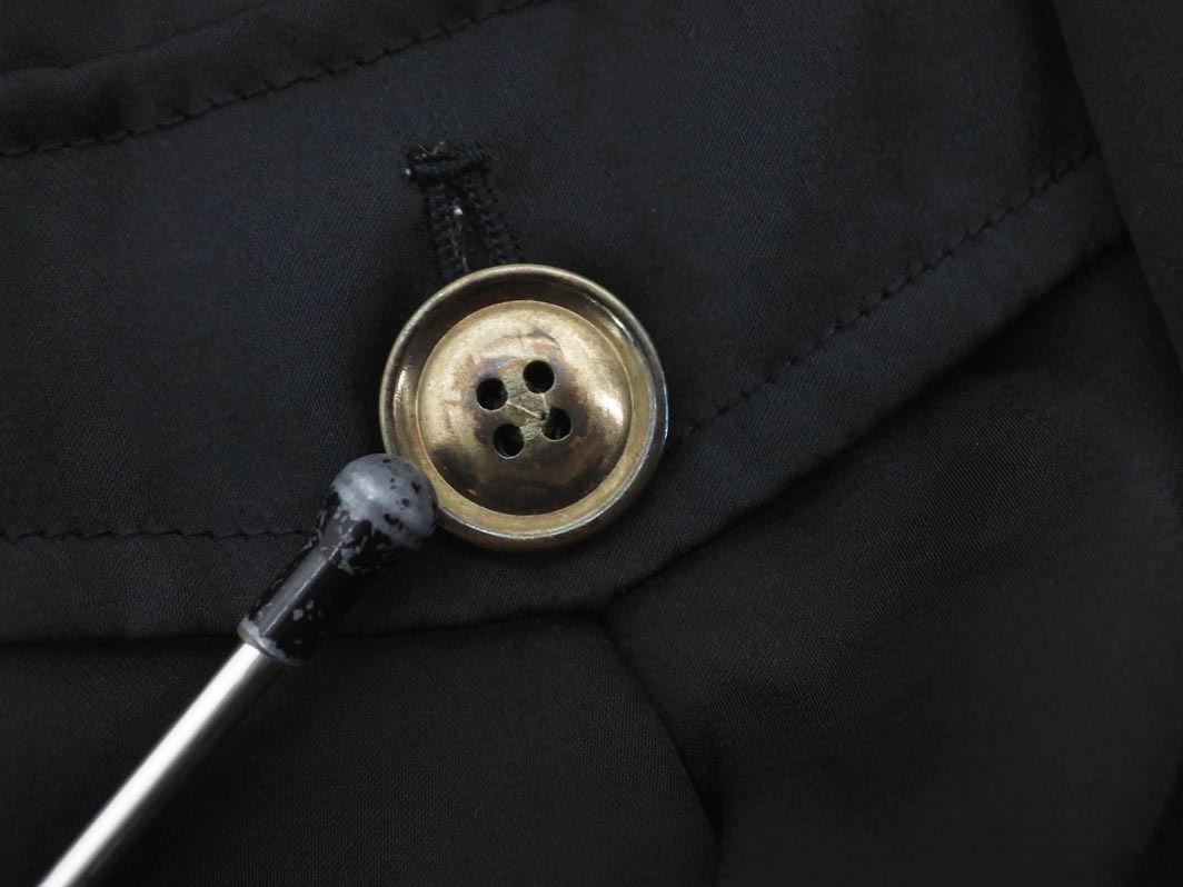前面・身ごろ左下のポケットボタンにヨゴレがございます。
