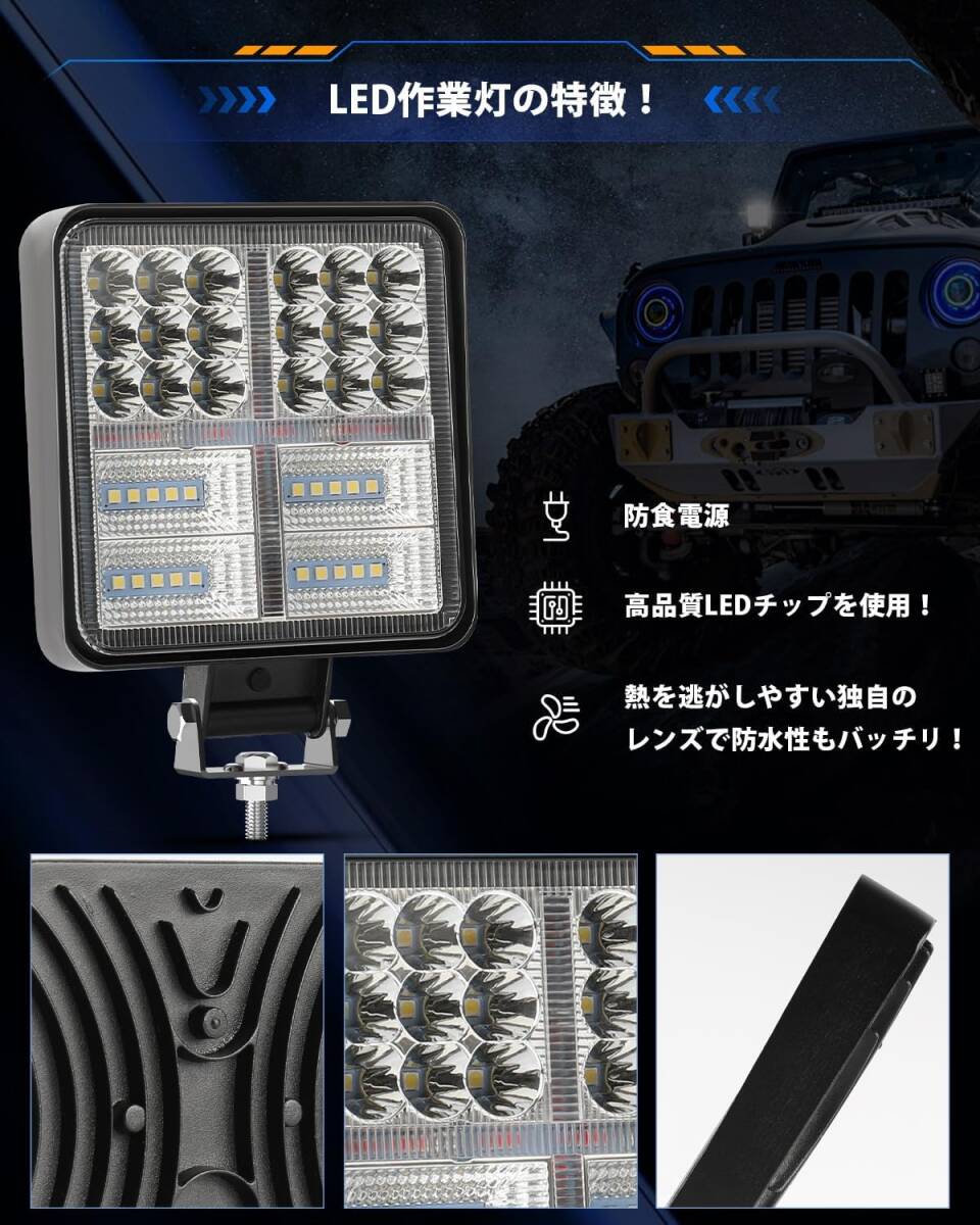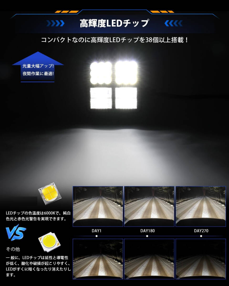 【製品仕様】LED作業灯:超高効率LEDが眩しい明るさを実現!このLED作業灯は白色光と赤色光の警告機能があり、「高輝度」「全方向拡散」「低消費電力」「長寿命」という特徴を持っています。動作電圧:12-24v(DC)