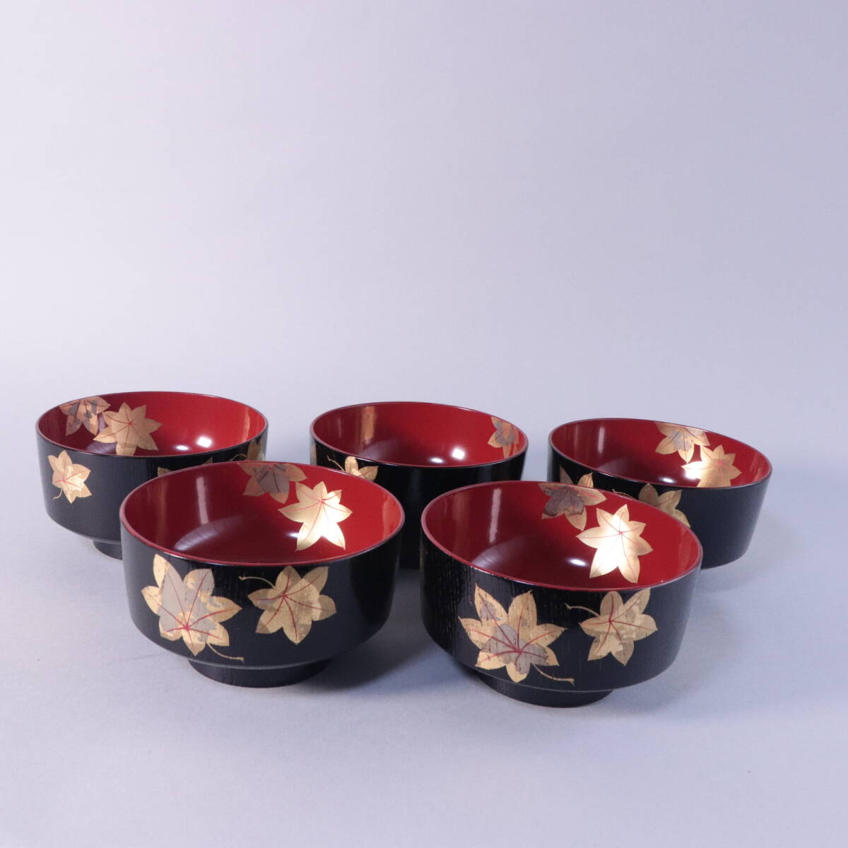 山中塗 耕峰 作 紅葉小鉢揃 五客 木製漆器 伝統工芸 漆芸 蒔絵 汁椀 C3