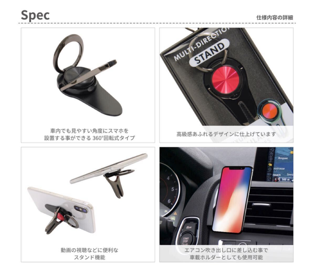 ・リング部分と車載ホルダー部分が360°回転式で、車内でも見やすい角度にスマホを設置する事ができます!