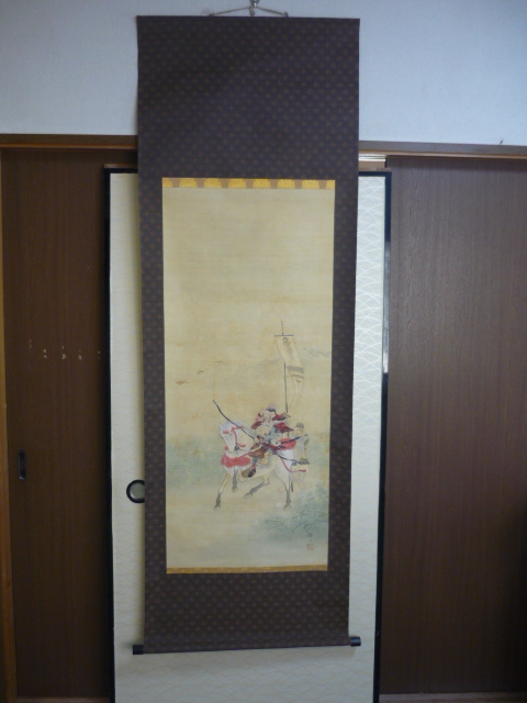 【模写】 掛軸 椿櫻湖 武者絵 絹本 大きさ全体約190x64cm 絹本部分約115x50cm