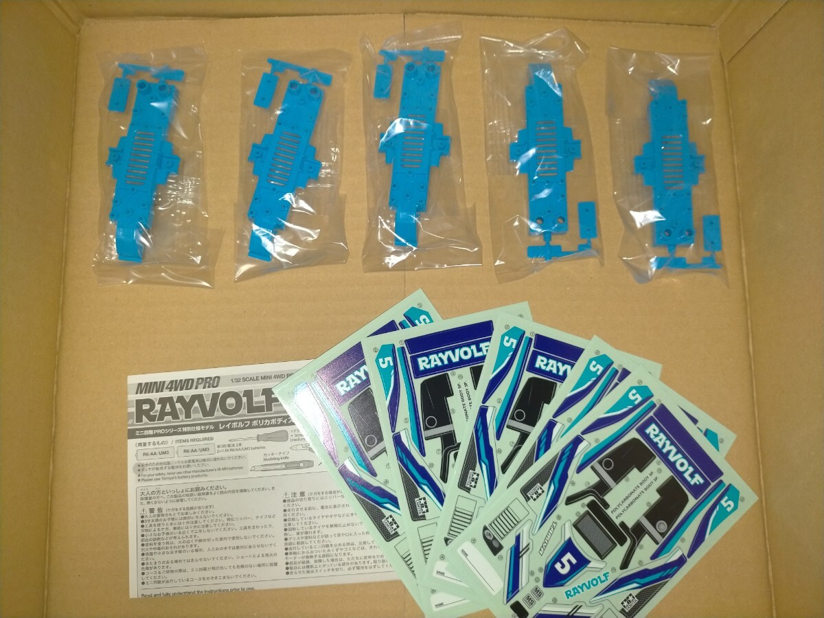 ミニ四駆の『エクスフローリー ポリカボディ 5台分』と『レイボルフ ポリカボディ 5台分』の合計10台分セット(未使用品)の出品です。