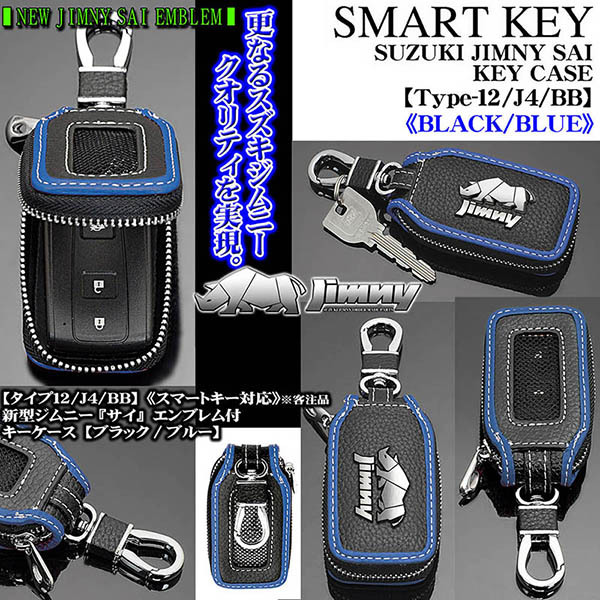 タイプ12・J4/BB/スズキ新型ジムニー/ロゴ+サイ/エンブレム付キーケース/ブラック・ブルー/キーホルダー/窓付/スマートキー/ブラガ