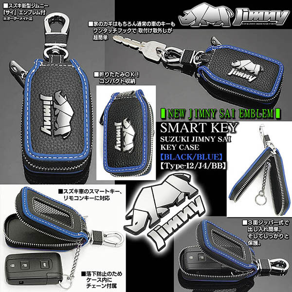 Product name: タイプ12・J4/BB/スズキ新型ジムニー/ロゴ+サイ/エンブレム付キーケース/ブラック・ブルー/キーホルダー/窓付/スマートキー/ブラガ