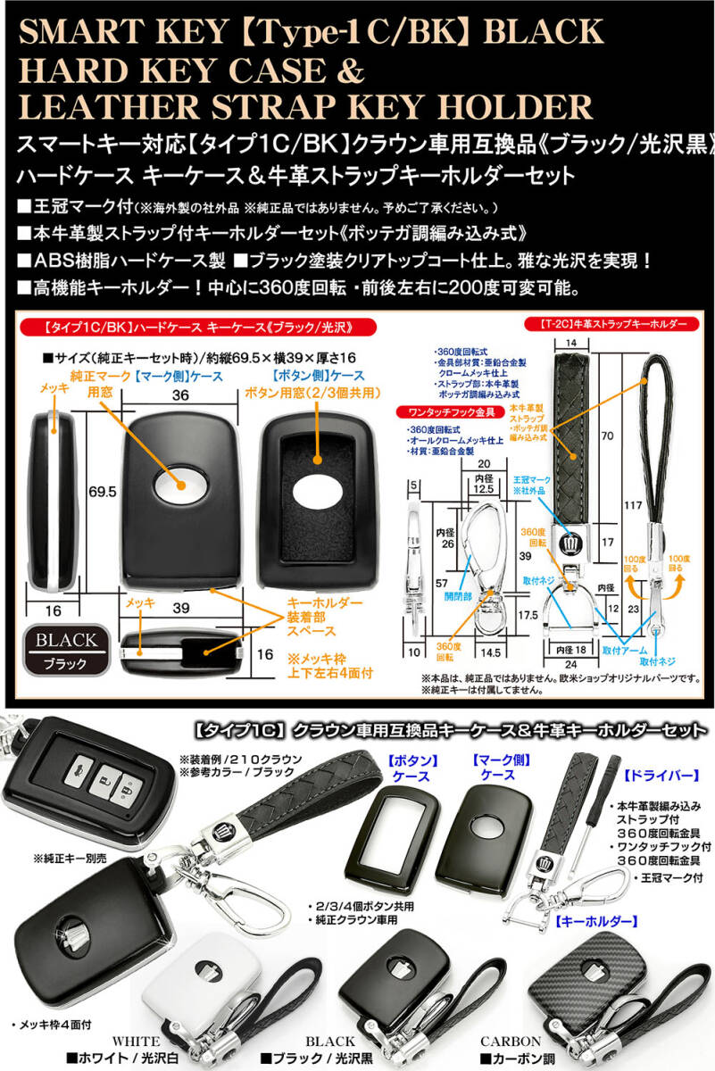 タイプ1C/BK(210系クラウン/210系マジェスタ】《ブラック/光沢黒》スマートキー対応ハードケース キーケース&クラウン王冠エンブレム付牛革ストラップ キーホルダーセット