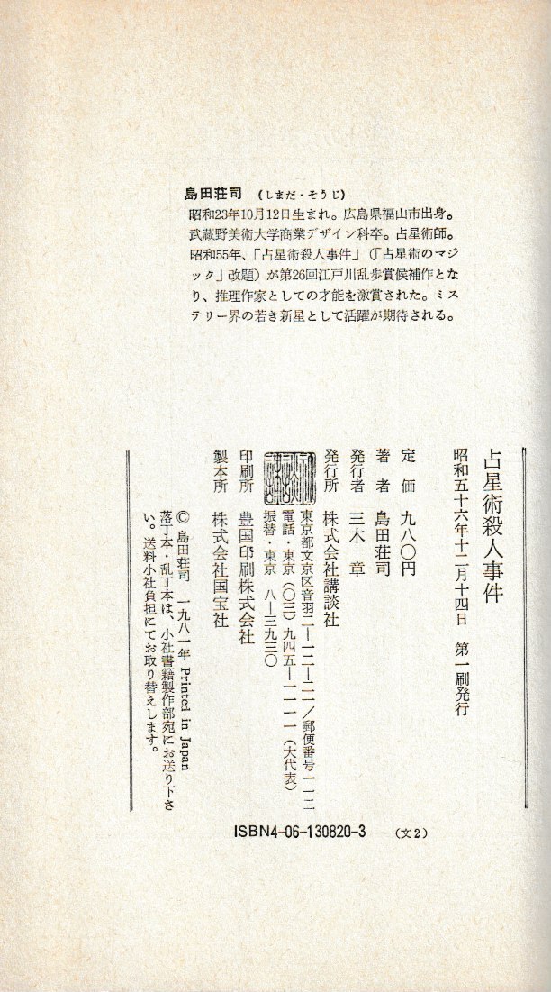 Product name: 島田荘司「占星術殺人事件」単行本、カバー・帯付き、第1刷、サイン