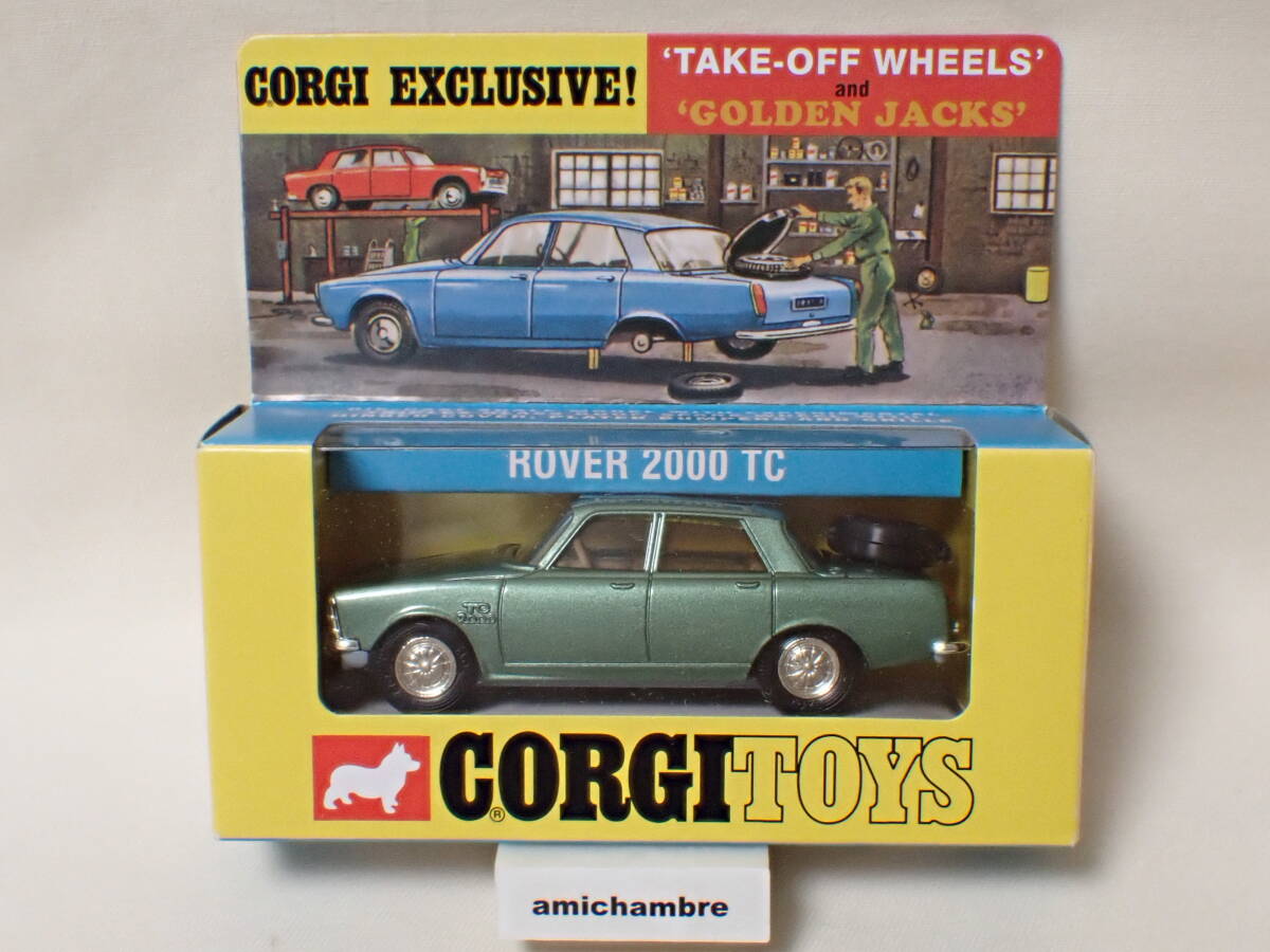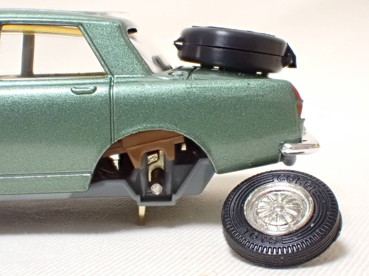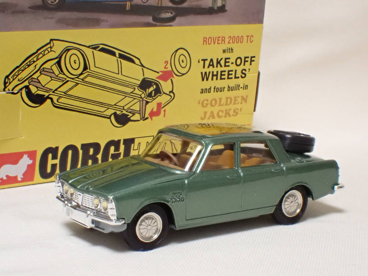 Corgi Toys 1/43 (1/46)  Rover P6 2000 TC      珍しい、ローバーP6のテイクオフ・ホイール・モデルの復刻版です。おそらく、日本未輸入モデルだと思います。撮影のため開封しています。 シャシーのレバーでタイヤが取外し出来、トランクのエンクルーアを開けるとスペアタイヤが収納され取出せます。当時の雰囲気が細かく再現されています。それでは、どうぞ宜しくお願い致します。