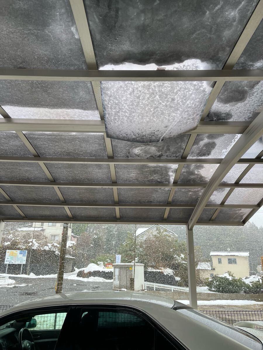 画像1の通り設置していましたが、4年前に2階屋根からの落雪の衝撃で画像2のとおり骨組みのアルミ角パイプ、ポリカ板を骨組みに押さえるアルミ板材、屋根のポリカ板、アルミアーチ梁の一部を損傷しました。廃棄するのももったいないと思い、アルミ角パイプは画像3の通り損傷した箇所を切断した上で別のアルミ角材をはめ込み、ねじ止めして概ね真っすぐに矯正しています。ポリカ板を骨組みに押さえるアルミ板材は画像4のとおり寸法が大きく変化しない程度に叩いておよその形に戻しています。ポリカ板は一部、変形したままですが、組み上げてアルミ板材で押さえればよろしいかと思います。さらに、このカーポートを撤去するため、アルミ柱をコンクリート基礎面で切断しましたので、残されたアルミ柱の高さは、約2250mm2本、約2300mm2本となっており、この部材をカーポートとして再利用するには、アルミ柱を何らかの方法でかさ上げ(一般的にアルミ柱の埋め込み深さは500~600mmとされていますので、長さ750mmくらいのオーバーサイズの角材を4本用意され、これにアルミ柱をボルトで固定した上で地中に埋設する等)する必要があります。ちなみにアルミ柱の外形寸法は、135mm、80mmです。アルミアーチ梁や雨樋アルミ材は少し歪みがありますが、そのまま使用できる状態と思われます。アルミ角パイプは強度計算をして矯正したものではないため、新品時の強度(耐降雪量20cm)が確保されているとは思いません。そのため降雪量が恒常的に10cmを超える地域には不向きとお考え下さい。本品はアルミアーチ梁の長さ(幅)が概ね6mあり、部品の点数も多いため発送はできません。それを積載できる車両での引き取り限定とします。なお、一番重いアルミアーチ梁でも一人で持ち上げることができるくらいの重量ですので、クレーン車、ユニック車でなくても大丈夫です。積載のお手伝いも致します。欠品は、ポリカ板を骨組みに押さえるアルミ板材を取り付けるネジが20本程度、縦の雨樋を柱に固定するプラスチックの輪っか部品くらいです。撤去してから掃除・洗浄はしていませんので、汚れや傷はそれなりにあります。現物確認は歓迎です。ぜひ、ご覧になって納得されて入札・購入をお願いします。現物は広島北ICから約10分の場所にあります。なお、設置したときの概略寸法は、横幅5m×奥行4.8m(屋根部)くらいになります。上記のような商品のため、お決まりの「3N」でお願いします。発送までの日数、2〜3日となってしまいますが、こちらで発送は致しませんし、発送の手配も致しません。引取りのみでの出品です。降雪の少ない地域にお住まいでかっこよさや新品にこだわらず、たちまち屋根を設けたい方にお手頃かと思います。