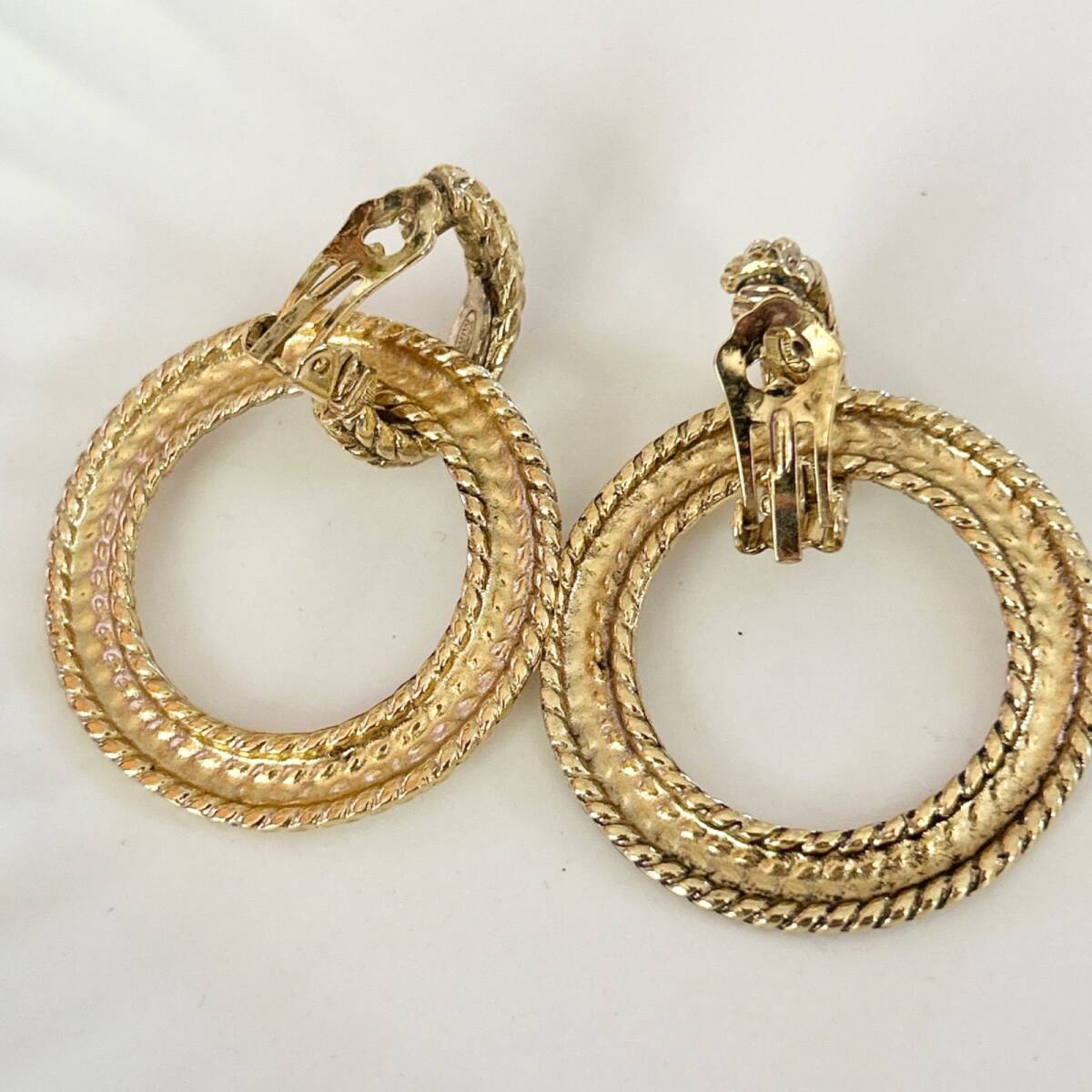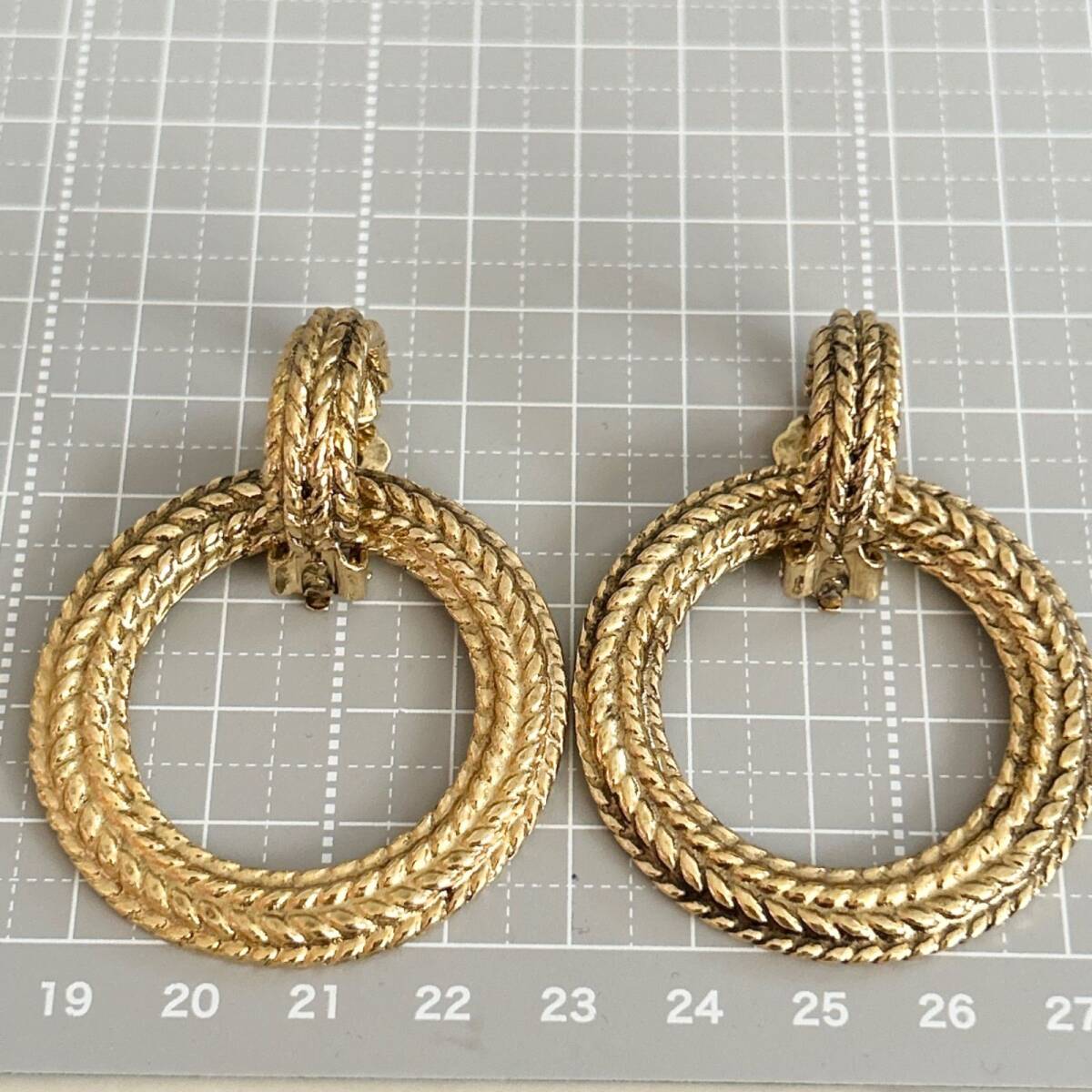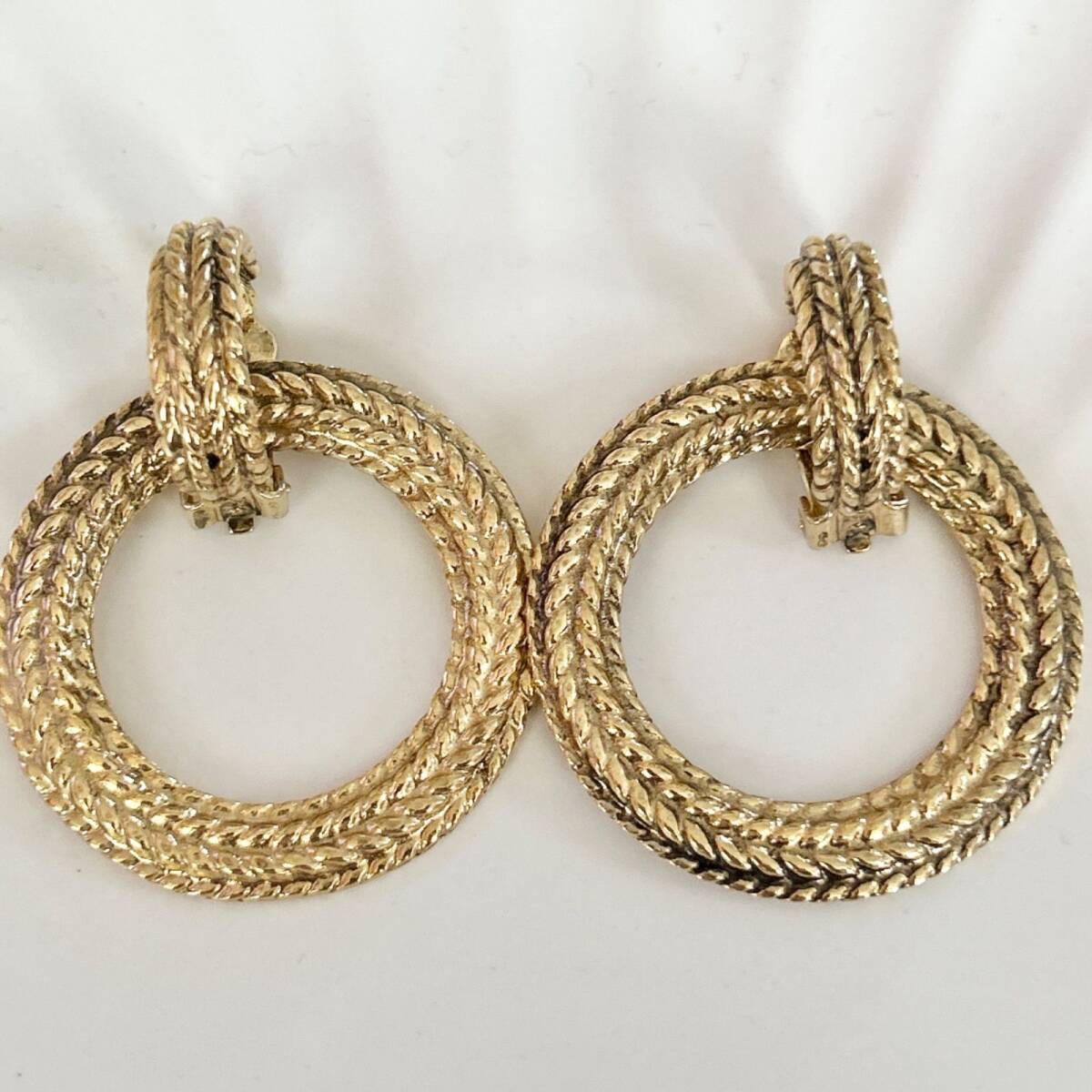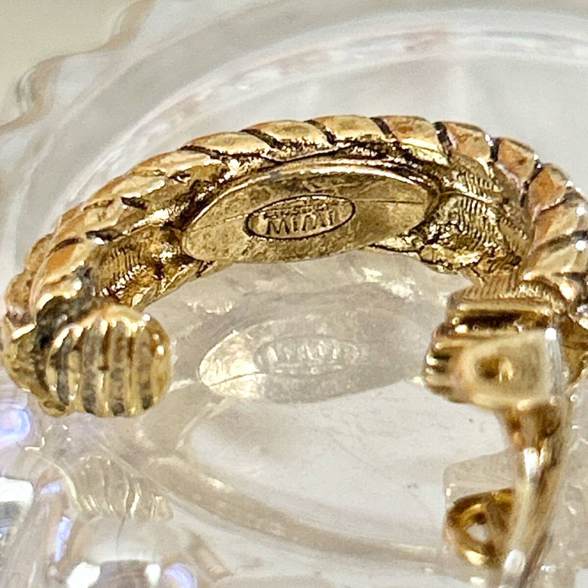 イタリア製のヴィンテージブランド「MIMI(ミミ)」による、大ぶりでインパクトのあるサークルモチーフのイヤリングです。ゴールドカラーの立体的な編み込み風デザインが、レトロながらも洗練された雰囲気を演出してくれます。耳元に華やかさを添える存在感のあるサイズ感で、シンプルなコーディネートのアクセントとしておすすめです。