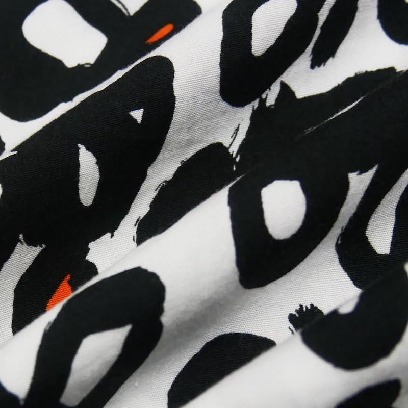 手書き感のあるレオパードに部分的にオレンジに塗られた配色が絶妙で遊び心のある総柄に仕上がっています。