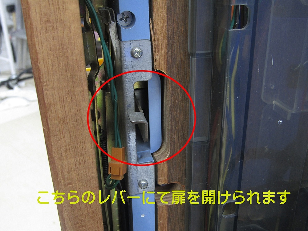 鍵の付属は御座いませんが正面扉は裏側にあるレバーにて開けられます。
