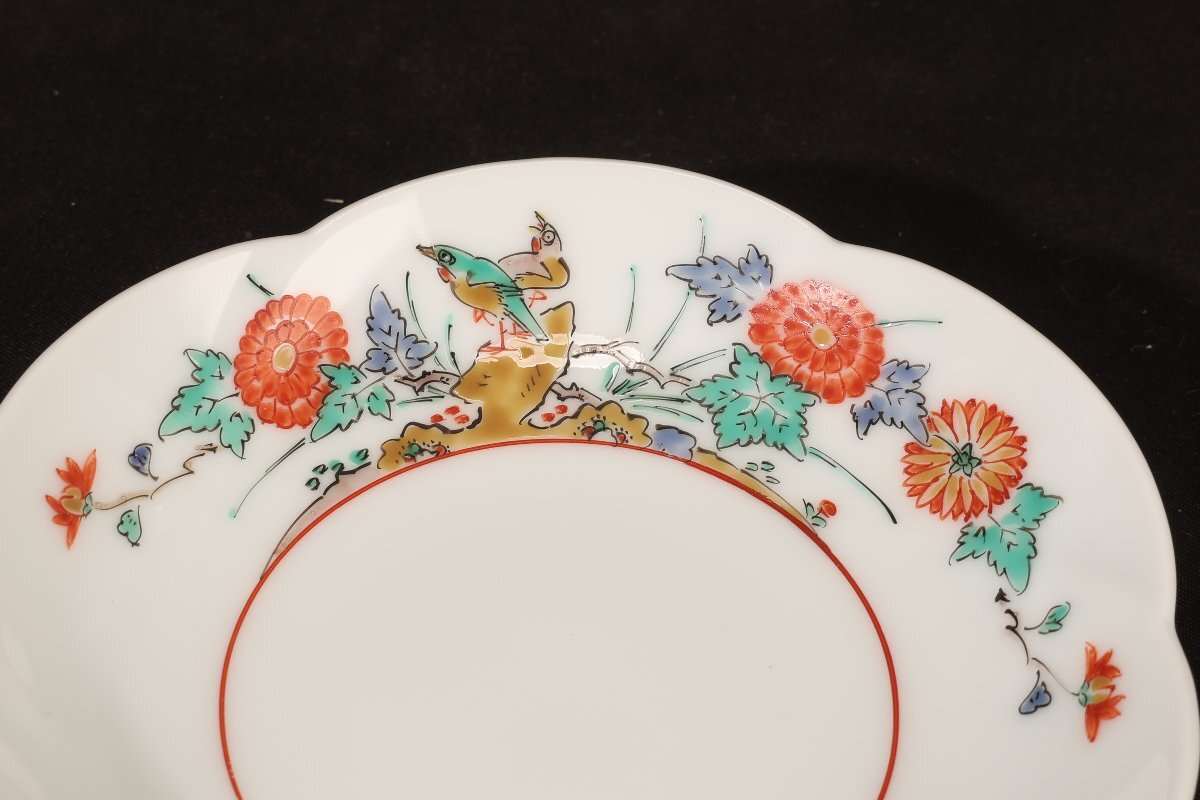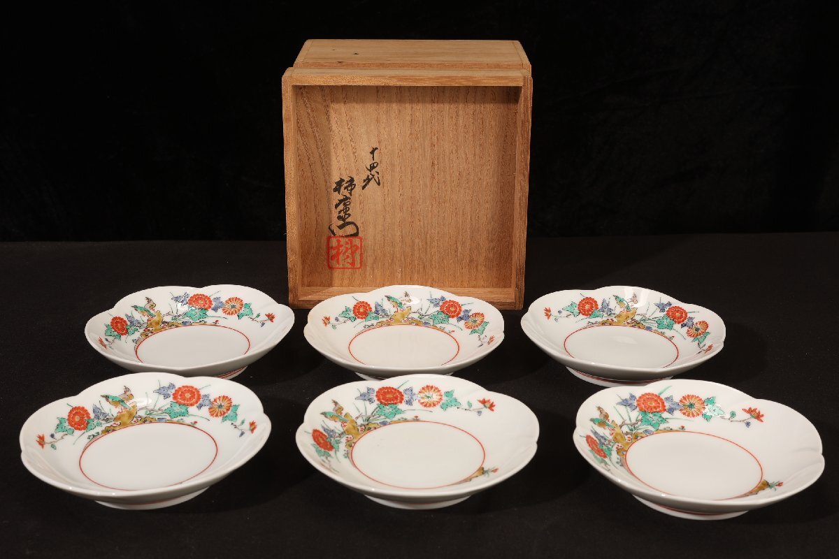 【珍品堂】1円から U10-J24 有田焼 人間国宝 十四代 柿右衛門作 錦梅菊紋 皿 6枚 共箱 木箱 茶道具 煎茶道具 古美術 骨董品 本物保証