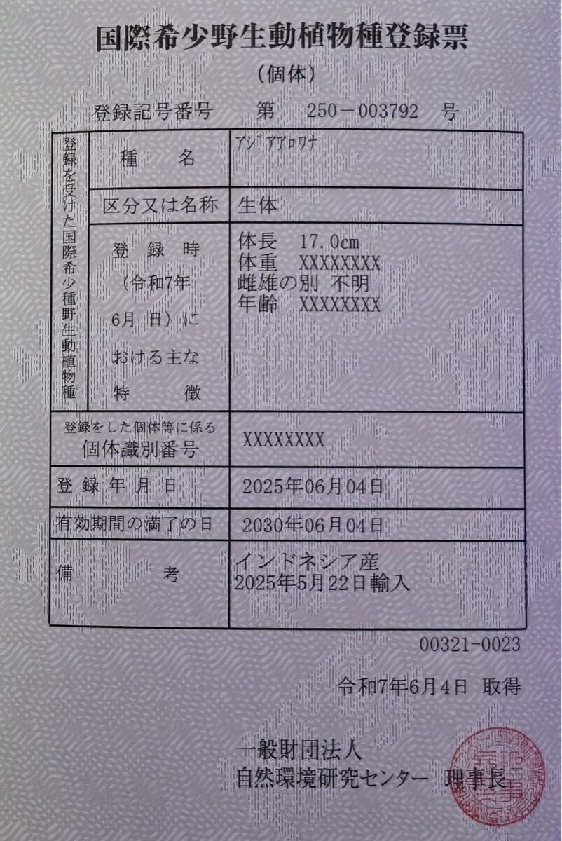 法律により、登録された個体等の譲受け等を行った者(主に購入者)はその所在を明らかにする為に登録機関に対し、その旨を届出ることが義務づけられています。落札者様は下記の登録機関まで届出書の提出をお願い致します。登録機関:一般財団法人自然環境研究