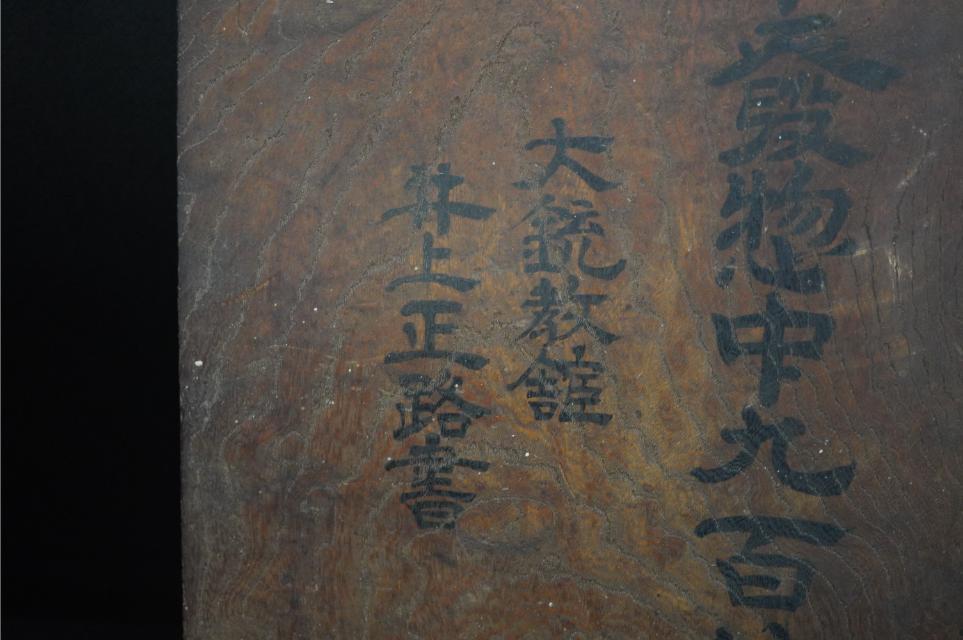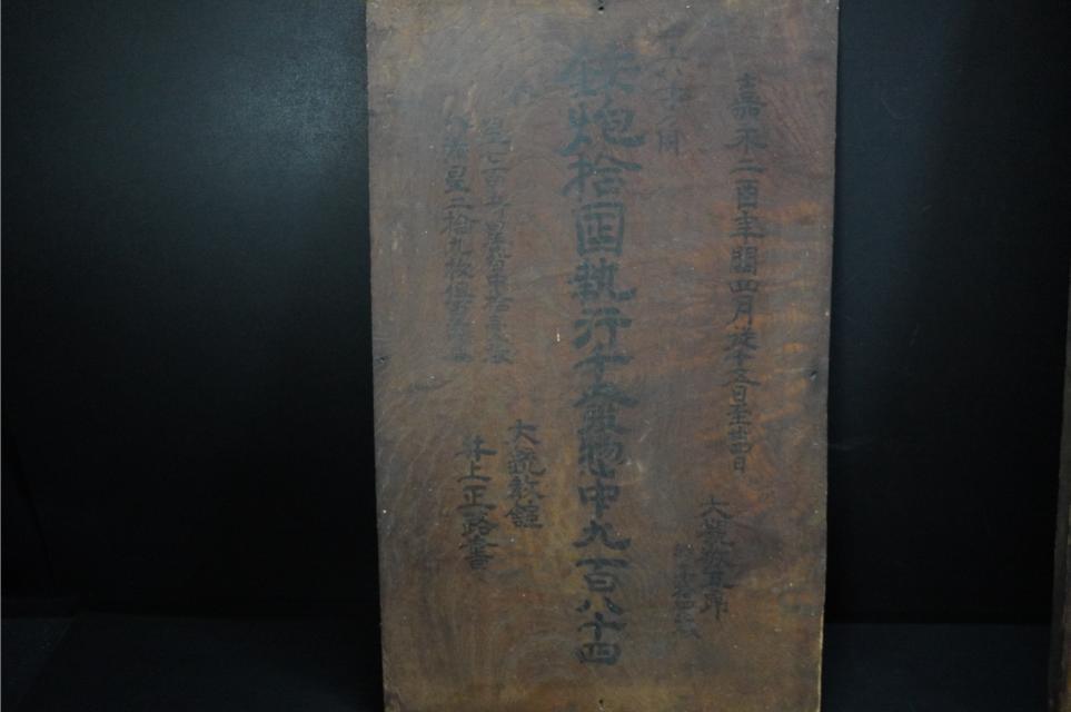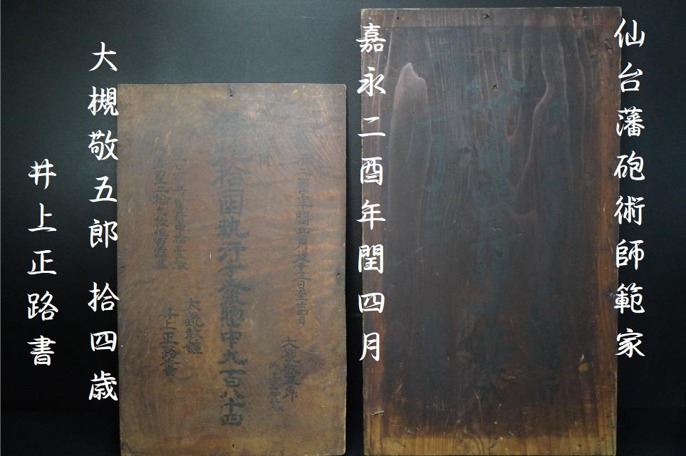 仙台藩砲術師範家 大槻敬五郎 拾四歳 砲術結果の書 扁額板 2枚「嘉永二酉年閏四月 大銃教館 (幕府師範) 井上正路 書」他 厚板1枚です。