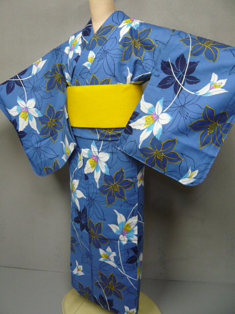 Product name: ひめうさぎ♪浴衣◆深く渋い青紫系地◆素敵な百合の花の模様色々◆綿◆未使用品◆裄63身丈142,5