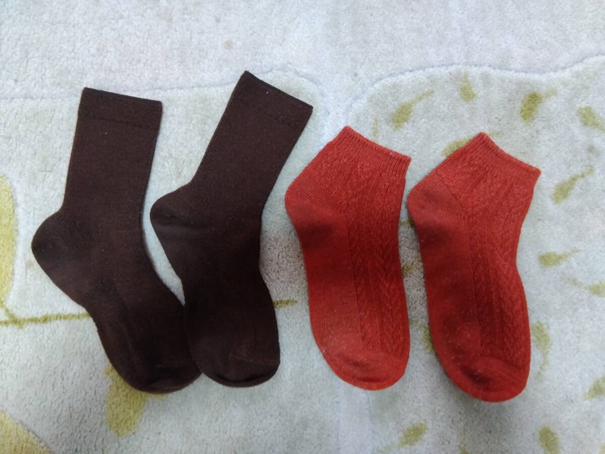 1、2つ目画像の2足(赤に近いオレンジ、茶)は厚手で冬用かもしれませんが、ゴムもしっかりしており、目立った汚れ、破れ、穴、スレなどなく十分使用できるものと思えます。若干赤い方は毛玉があります。