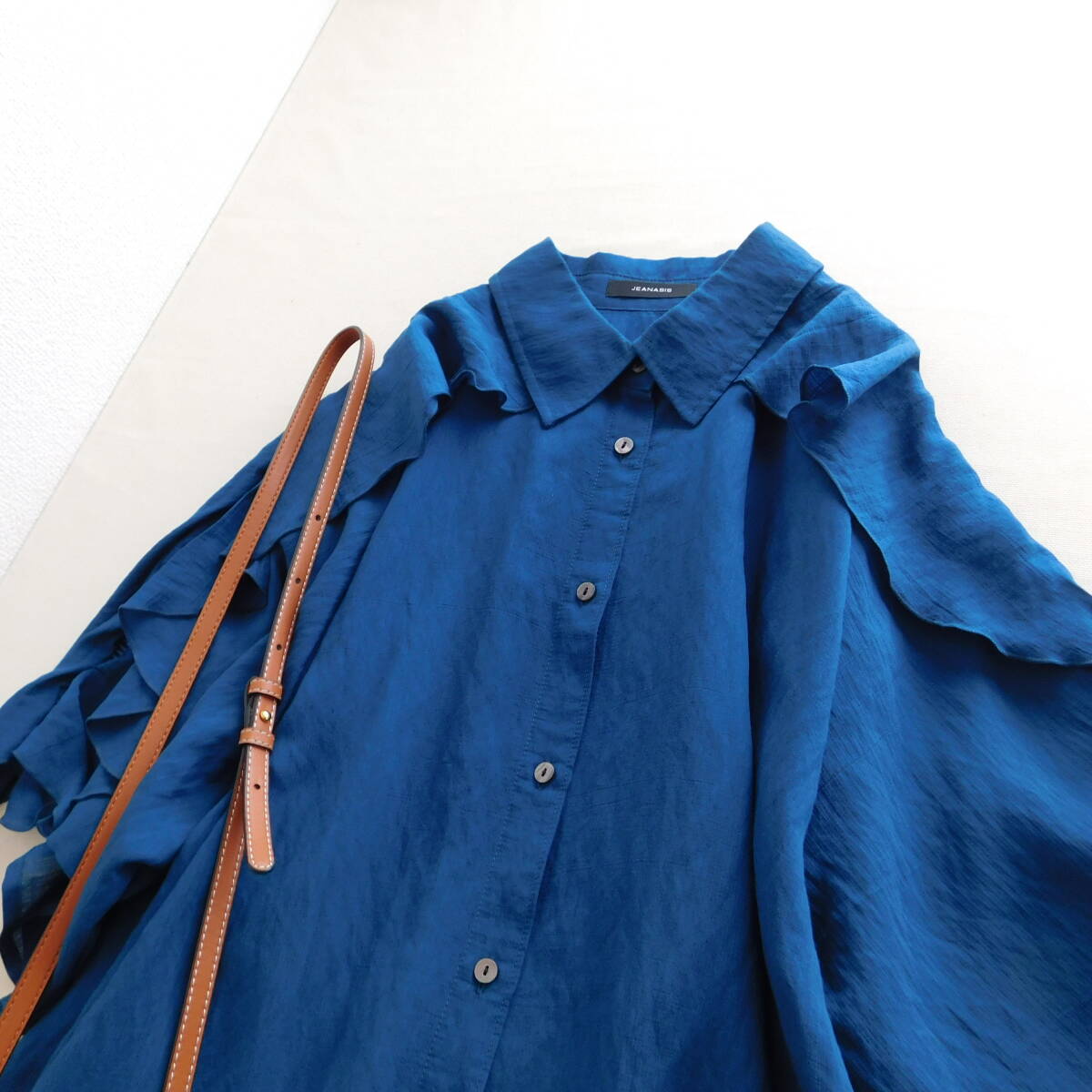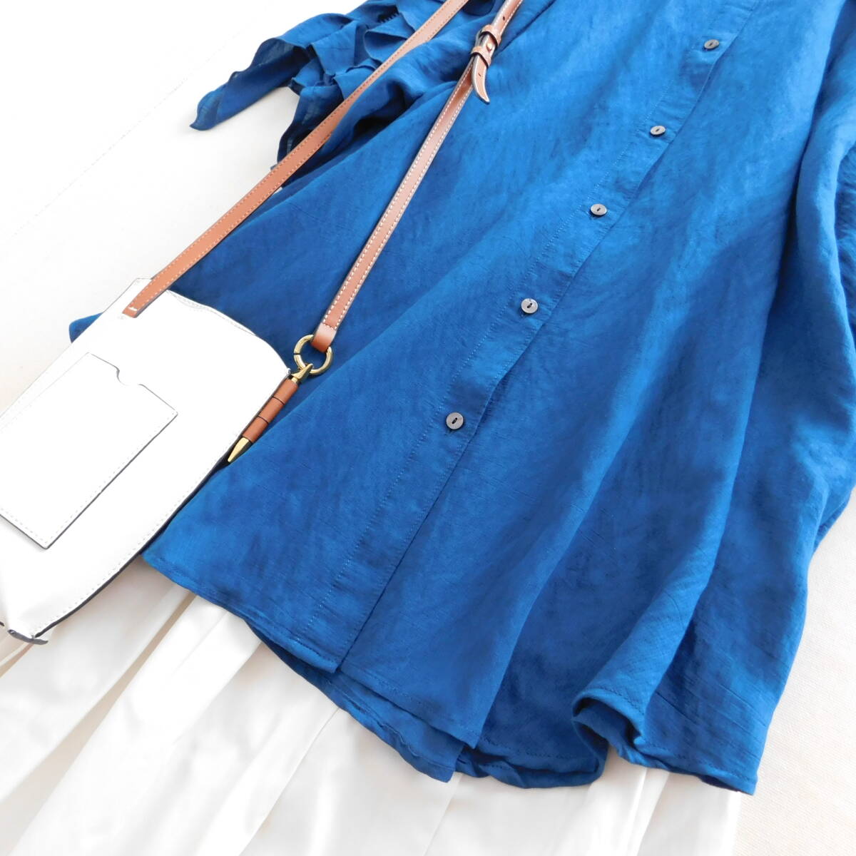 ターコイズブルーカラーにショルダーフリルのブラウスがかわいいです。
