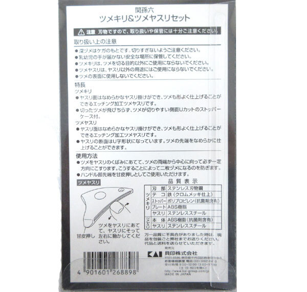 内 容 ■貝印 関孫六 ツメキリ&ツメヤスリセット (HC-1803)