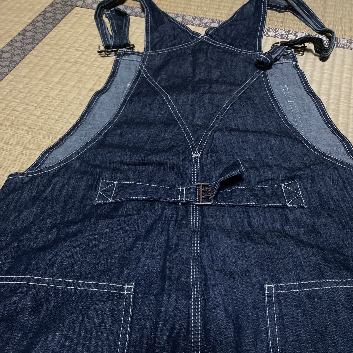 実寸サイズ   全長131cmウエスト部分45cm×2股下71cm裾幅20.5cm ×2です。全長は背中から股下の裾までです。肩当ては含めていません。股下は裾上げしておりません。フルレングスです。